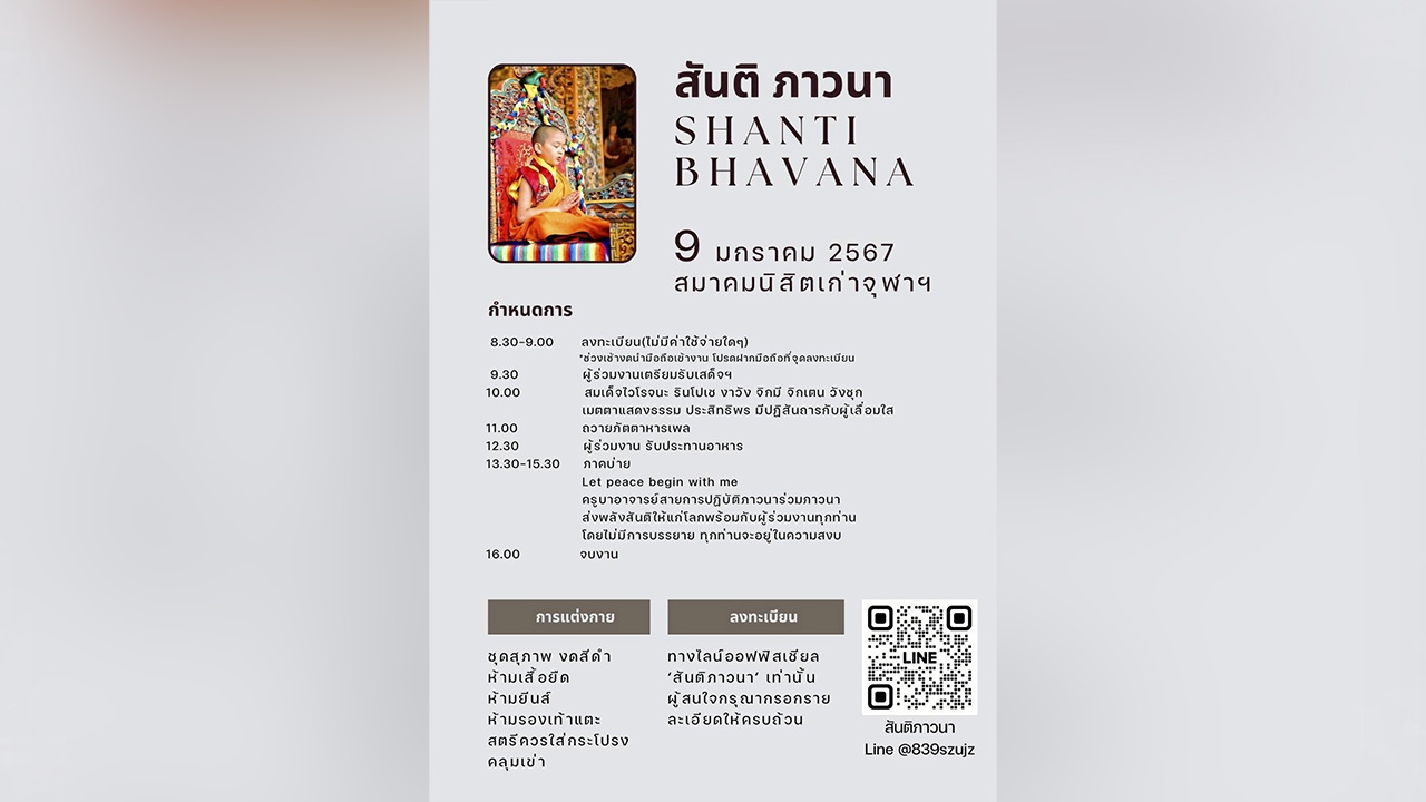เสริมมงคลต้นปี ขอเชิญศาสนิกชนเข้าเฝ้าฯรับเสด็จ สมเด็จพระชนนี ดอร์เจ วังโม วังชุกเจ้าหญิงโซนัม เดเซน วังชุก และสมเด็จไวโรจนะ รินโปเช งาวัง จิกมี จิกเตน วังชุก จากประเทศภูฏาน ในงาน Shanti Bhavana (สันติ ภาวนา) วันที่ 9 มกราคม 2567 ณ สมาคมนิสิตเก่าจุฬาลงกรณ์ ถ.พญาไท กิจกรรม ภาคเช้า 08.30-09.00 ลงทะเบียนจากนั้น ผู้ร่วมงานเตรียมรับเสด็จฯ สมเด็จไวโรจนะ รินโปเช งาวัง จิกมี จิกเตน วังชุก เมตตาแสดงธรรม ประสิทธิพร มีปฏิสันถารกับผู้เลื่อมใส ร่วมฟังธรรมจากท่านรินโปเช ถวายภัตตาหาร และร่วมรับพรมุขปาฐะที่สำคัญ ภาคบ่าย ร่วมนั่งปฏิบัติภาวนาอยู่ในความสงบ (Silent Meditation) เพื่อสร้างกระแสความสั่นสะเทือนแห่งสันติให้แก่โลก ซึ่งจะใช้เวลาตรงนี้มากที่สุด เน้นความสำคัญแห่งความเงียบสงบ ไร้ตัวตน (ไม่มีการบรรยายใดๆ) ผู้มาร่วมงานการแต่งกายด้วยชุดสุภาพ ห้ามเสื้อยืด,ห้ามยีนส์, ห้ามรองเท้าแตะ, ห้ามแต่งกายด้วยสีดำ,สตรี ควรใส่กระโปรงคลุมเข่า ผู้สนใจร่วมงานการลงทะเบียน ทาง Line Official Line@839szujz เท่านั้น.อ่าน “คอลัมน์หนังสือพิมพ์ไทยรัฐ” ทั้งหมดที่นี่
