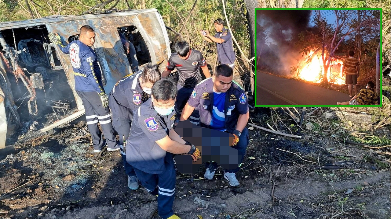 หน่วยกู้ภัยช่วยกันนำร่างนักท่องเที่ยวชาวจีน หลังประสบอุบัติเหตุขณะนั่งรถตู้โตโยต้า อัลพาร์ด เสียหลักชนต้นไม้พุ่งตกถนนไฟลุกท่วมทั้งคัน บริเวณริมถนนบายพาส ชะอำ-ปราณบุรี ฝั่งขาเข้ากรุงเทพฯ ใกล้แยกห้วยตาแปด อ.ชะอำ จ.เพชรบุรี ถูกไฟคลอกไหม้เกรียม อนาถคาซากรถ และมีผู้โดยสารได้รับบาดเจ็บสาหัสอีก 2 คน.อ่าน “คอลัมน์หนังสือพิมพ์ไทยรัฐ” ทั้งหมดที่นี่