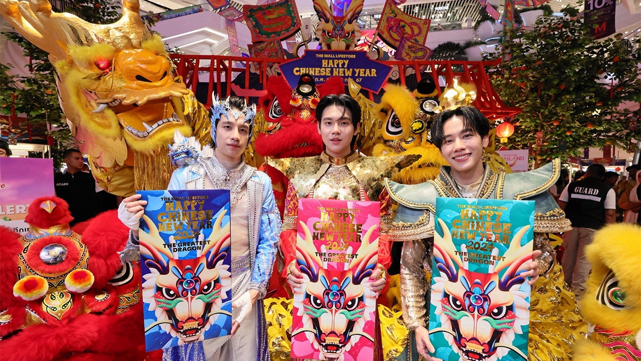 สามนักแสดงคนดัง หยิ่น อานันท์-วอร์ วนรัตน์-พร้อม ราชภัทร เป็นตัวแทน พญาเทพมังกร ร่วมอวยพร ปีใหม่ชาวไทยเชื้อสายจีน ในงาน THE MALL LIFE STORE HAPPY CHINESE NEW YEAR 2024 เฮงไม่หยุด ฉุดไม่อยู่ ฉลองเทศกาลตรุษจีน 2567 อย่างยิ่งใหญ่ ของศูนย์การค้าเดอะมอลล์ ไลฟ์สโตร์ และเดอะมอลล์ ทุกสาขา ที่จัดระหว่างวันที่ 7-29 ก.พ. ในงานมีการระดมทัพอาหารกว่า 200 ร้านค้า 1,000 เมนูให้ได้อิ่มอร่อย พร้อมคัดสรร 8 เมนูมงคล.