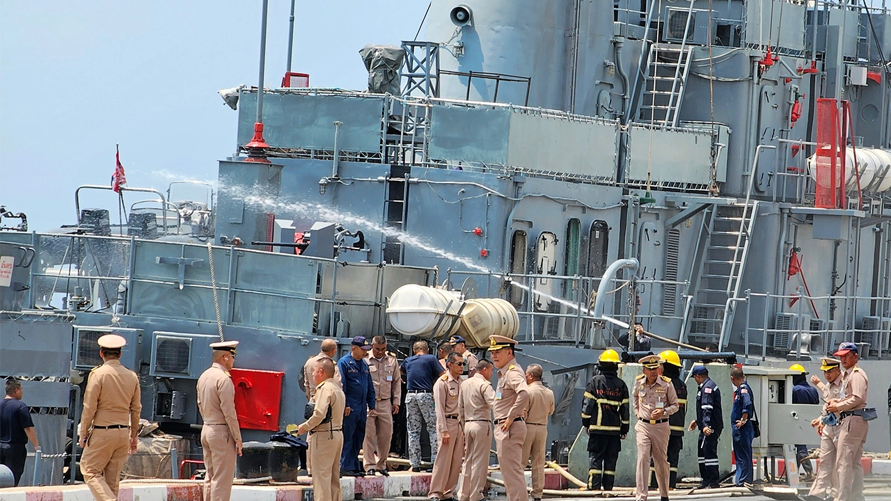 ทหารเร่งฉีดน้ำดับไฟบนเรือหลวงคีรีรัฐจอดเทียบท่าฐานทัพเรือสัตหีบ หลังเรือหลวงชลบุรีซ้อมรบกระสุนปืนใหญ่ 76 มม.ติดขัดลำกล้องแล่นเข้าเทียบท่า เกิดลั่นใส่ท้ายเรือหลวงคีรีรัฐ จนเกิดเพลิงลุกไหม้มีผู้บาดเจ็บ 14 นาย.อ่าน “คอลัมน์หนังสือพิมพ์ไทยรัฐ” ทั้งหมดที่นี่