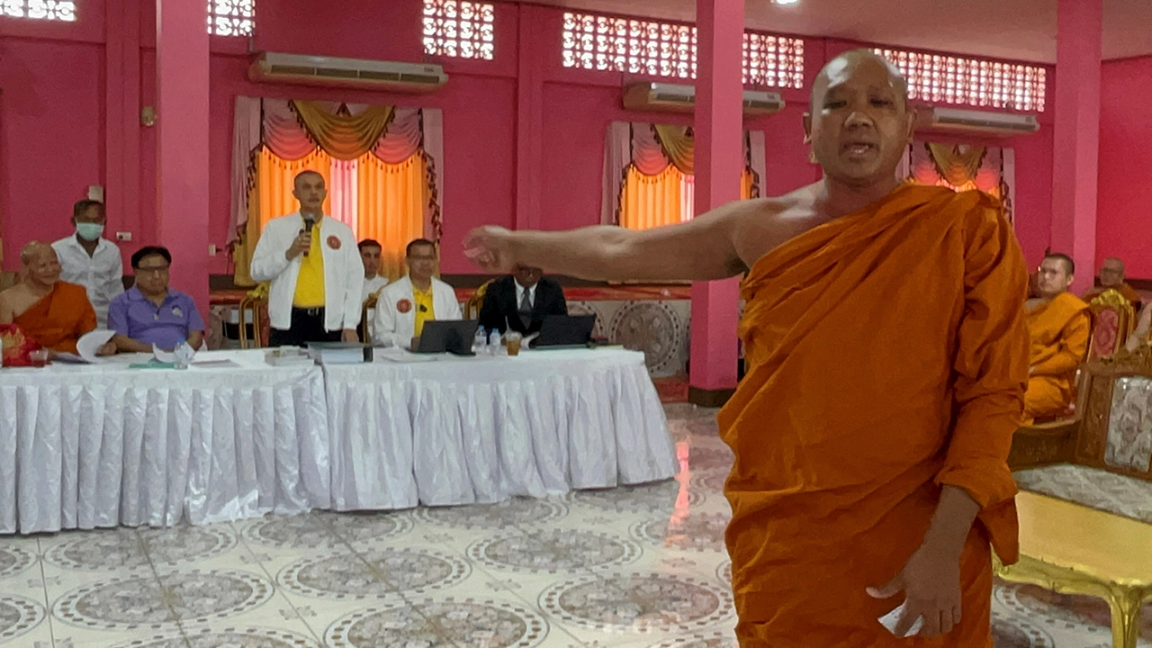 พระครูธรรมธรฐิติศักดิ์ อดีตเจ้าอาวาสวัดทวีการะอนันต์ อ.คลองหลวง จ.ปทุมธานี ยืนชี้นิ้วตอบโต้นายอนันต์ชัย ไชยเดช ทนายความ หลังได้รับมอบอำนาจจากเจ้าอาวาสปัจจุบันให้เป็นผู้จัดการดูแลผลประโยชน์วัดในที่ธรณีสงฆ์.