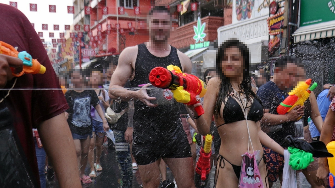 นักท่องเที่ยวสาวชาวต่างชาติใส่ชุดว่ายน้ำทูพีซเต้นตามจังหวะเพลงอย่างสนุกสนานขณะใช้ปืนฉีดน้ำไล่ฉีดน้ำใส่คนที่เข้ามาเล่นสงกรานต์ในถนนข้าวสารอย่างมันมือ ทั้งที่มีการประกาศห้ามแต่งกายโป๊เปลือยเข้ามาก็ตาม.