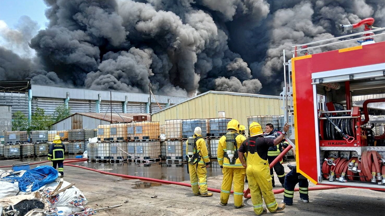 เจ้าหน้าที่ลากสายยางเข้าไปฉีดน้ำสกัดเปลวไฟที่ลุกไหม้อยู่ภายในโกดังเก็บกากสารเคมี บริษัทวิน โปรเสส จำกัด อ.บ้านค่าย จ.ระยอง ผ่านไปนานกว่า 9 ชม.ยังควบคุมเพลิงไม่ได้ มีกลุ่มควันดำทะมึนพวยพุ่งขึ้นเต็มท้องฟ้าพร้อมกับเสียงระเบิดดังต่อเนื่อง ต้องอพยพชาวบ้านบริเวณรอบโรงงานไปอยู่ที่ศูนย์พักพิงชั่วคราวเพื่อความปลอดภัย.