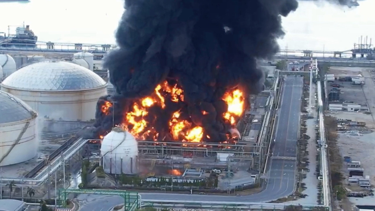 ภาพมุมสูงเปลวเพลิงที่ลุกไหม้แท็งก์จัดเก็บสารไพรโรไลสิส แก๊สโซลีน ของบริษัท มาบตาพุด แทงค์ เทอร์มินัล จำกัด ท่าเรืออุตสาหกรรมมาบตาพุด จ.ระยอง ลุกลามขยายวงกว้างไปยังแท็งก์จัดเก็บสารเคมีที่อยู่ติดกัน กลายเป็นทะเลเพลิงมีเปลวไฟแดงฉานควันดำโขมงไปทั่วบริเวณ.อ่าน “คอลัมน์หนังสือพิมพ์ไทยรัฐ” ทั้งหมดที่นี่
