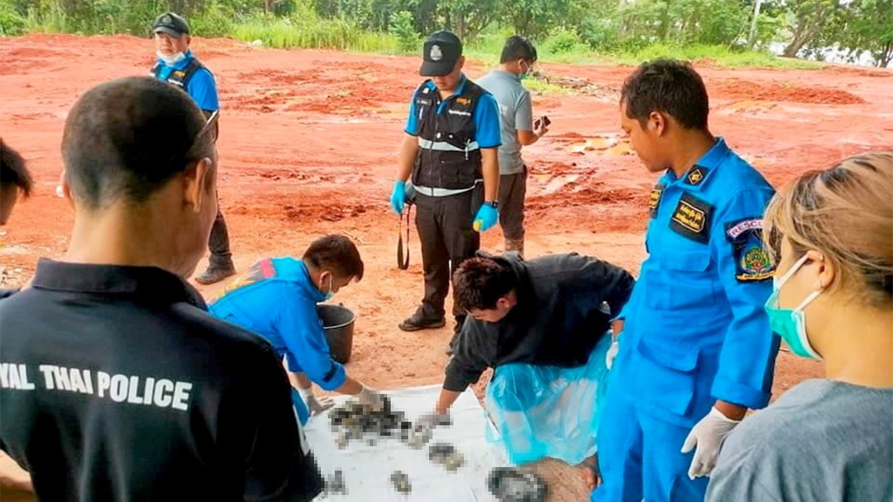 จนท.เก็บชิ้นส่วนโครงกระดูกนายคริสตอฟ เอร์โก ชาวเบลเยียม ถูกนายสตีฟ โรซินญง เพื่อนร่วมชาติ จ่อยิงเสียชีวิตแล้วเผานั่งยางบริเวณข้างบ้านกำลังก่อสร้างใน อ.เซกา จ.บึงกาฬ.