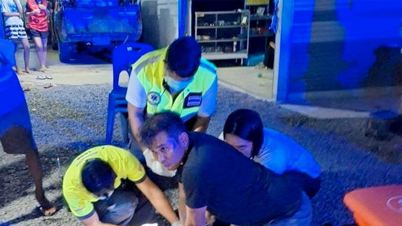 เจ้าหน้าที่เร่งช่วยนายนัฐนันท์ กาฬภักดี แต่สุดยื้อเสียชีวิตที่ อ.ด่านช้าง จ.สุพรรณบุรี หลังมีเรื่องทะเลาะกับเพื่อนรุ่นน้องวัย 15 ปี ปัญหารักสามเส้าเคลียร์กันไม่ลงตัว โดนมีดแทงคอ 2 แผลเลือดสาด.