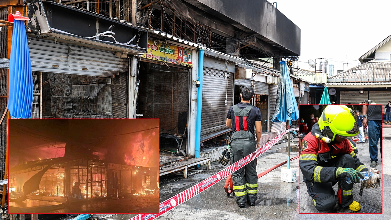 ตำรวจกั้นสถานที่เกิดเหตุในโครงการตลาดศรีสมรัตน์ โซนปลากัดและสัตว์เลี้ยง รวมทั้งสัตว์แปลกนำเข้าราคาแพงและหายากจากต่างประเทศ หลังเกิดไฟไหม้วอดทั้งโครงการ 118 ห้อง ไม่มีผู้ใดเสียชีวิตหรือบาดเจ็บยกเว้นสัตว์เลี้ยงนานาชนิดถูกไฟคลอกสลดนับพันตัว ส่วนภาพเล็กขวา เจ้าหน้าที่กู้ภัยใช้น้ำราดและปฐมพยาบาลไก่ตัวหนึ่งที่รอดชีวิต. อ่าน "คอลัมน์หนังสือพิมพ์ไทยรัฐ" ทั้งหมดที่นี่