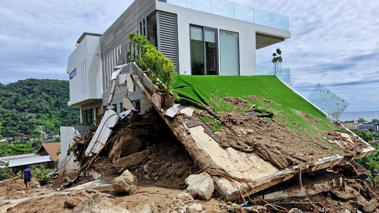 หนึ่งในวิลล่าหรู ต.กะรน อ.เมืองภูเก็ต ถูกดินโคลนสไลด์ถล่มพังเสียหายพร้อมๆกับบ้านเรือนใกล้เคียงพังราบเป็นหน้ากลองกว่า 50 หลัง พบผู้เสียชีวิต 10 ศพ บาดเจ็บ 19 คน และสูญหาย 1 คน.อ่าน “คอลัมน์หนังสือพิมพ์ไทยรัฐ” ทั้งหมดที่นี่