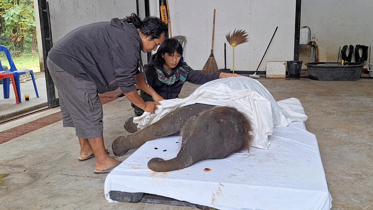 ควาญช้างนำผ้ามาคลุมร่างลูกช้างพัง “กันยา” ช้างน้อยกำพร้าหลงโขลงในเขตรักษาพันธุ์สัตว์ป่าภูวัว จ.บึงกาฬ ที่อยู่ในความดูแลของฟาร์มช้าง Patara Elephant Conservation อ.หางดง จ.เชียงใหม่ เกิดติดเชื้อเฮอร์ปีส์ไวรัสที่มักเกิดในลูกช้างอายุไม่ถึง 10 ปี อาการทรุดหนักและล้มลงอย่างสงบขณะรักษาอยู่ในโรงพยาบาลช้าง สถาบันคชบาลแห่ง ชาติ จ.ลำปาง แฟนคลับสุดเศร้าต่างโพสต์อาลัย.อ่าน "คอลัมน์หนังสือพิมพ์ไทยรัฐ" ทั้งหมดที่นี่