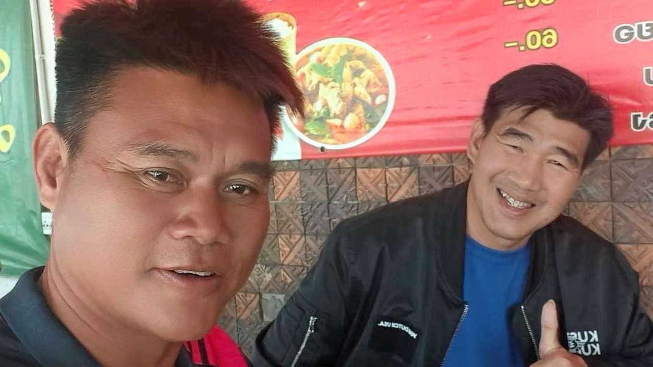 นายสมรักษ์ คำสิงห์ อดีตนักมวยเหรียญทองโอลิมปิก ยกนิ้วบอกขอสู้ต่อ ขณะมากินข้าวกลางวันกับนายพิเชษฐ์ ชิเนหันทา หรือเป๊กโก้ รุ่นน้องคนสนิท หลังศาลจังหวัดขอนแก่นพิพากษาจำคุกคดีพยายามข่มขืนสาววัย 17 ปี.