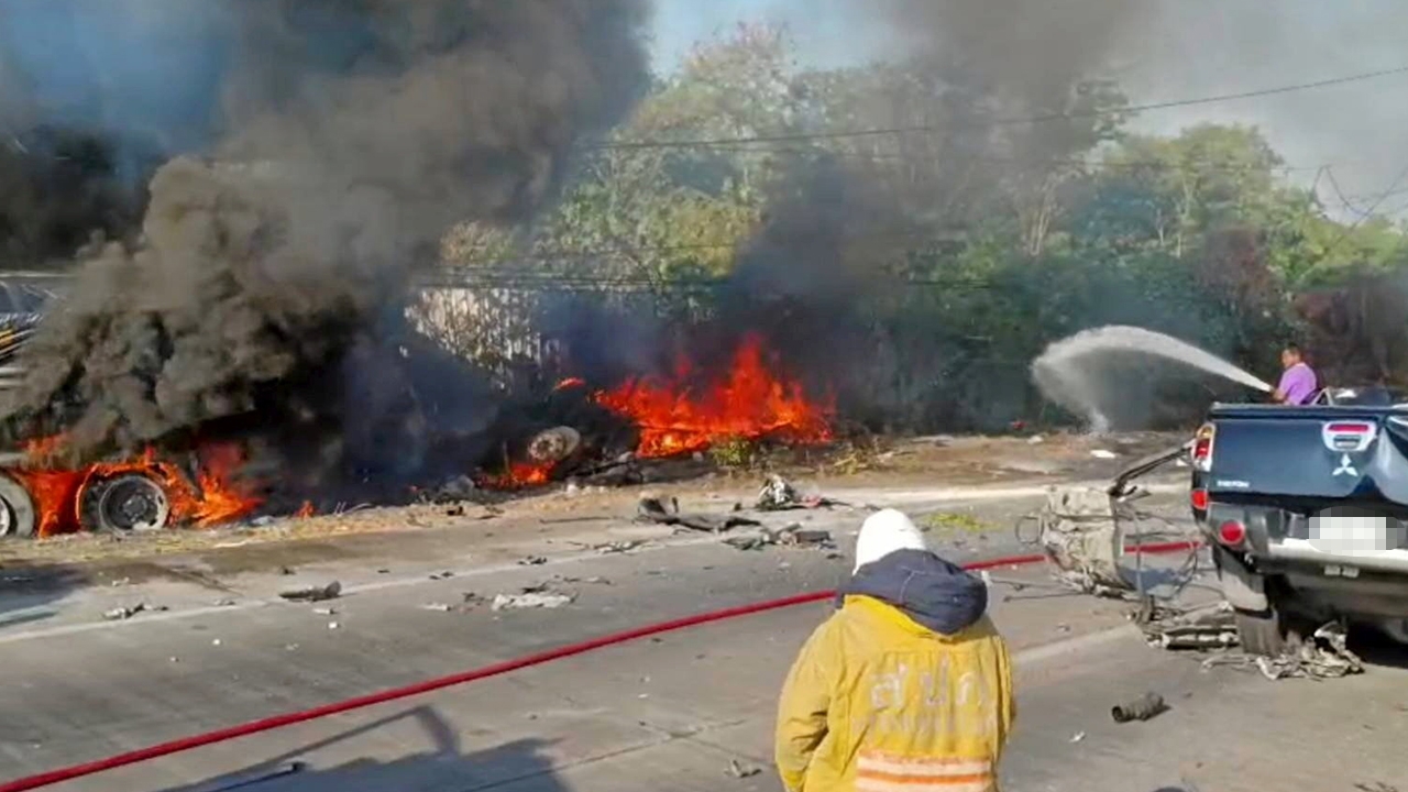 สภาพรถกระบะถูกรถพ่วง 18 ล้อ เสียหลักเหินข้ามเกาะกลางถนนพุ่งชนพังยับ ส่งผลให้นายอานพ ทองตัน คนขับรถกระบะถูกอัดก๊อบปี้เสียชีวิตพร้อมลูกเมีย รวม 3 ศพ บนถนนพหลโยธิน ต.นายาว อ.พระพุทธบาท จ.สระบุรี.อ่าน "คอลัมน์หนังสือพิมพ์ไทยรัฐ" ทั้งหมดที่นี่