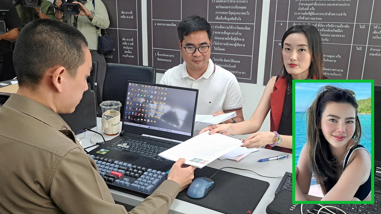 นายวิฑูรย์ เก่งงาน พา น.ส.ณัฐจุฑา ปุณณธนาวัฒน์ ตัวแทนผู้รับมอบอำนาจจากบริษัท แบรนด์เนม มันนี่ จำกัด เข้าแจ้งความกับพนักงานสอบสวน สน.ปทุมวัน ให้ดำเนินคดีกับ “ดิว อริสรา” (ภาพเล็ก) ข้อหาฉ้อโกง กรณีเอาสร้อยของผู้อื่นมาขายฝากโดยหลอกลวงว่าเป็นของตัวเอง.