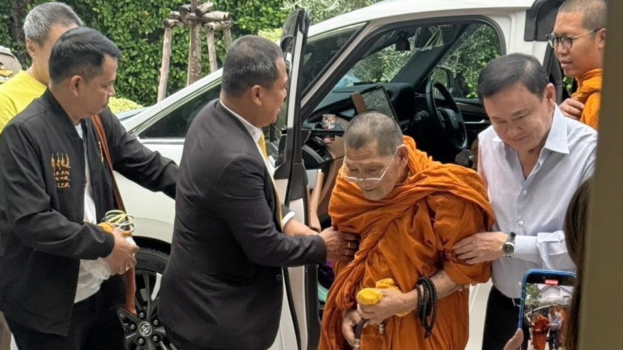 นายทักษิณ ชินวัตร อดีตนายกรัฐมนตรี รับพระราชวัชรธรรมโสภณ (หลวงปู่ศิลา สิริจันโท) เจ้าอาวาสวัดพระธาตุหมื่นหิน จ.กาฬสินธุ์ พระเกจิดังฯลงจากรถ หลังนิมนต์มาถวายเพลที่บ้านจันทร์ส่องหล้า มี น.ส.พินทองทา ชินวัตร คุณากรวงศ์ ลูกสาว ร่วมด้วย.