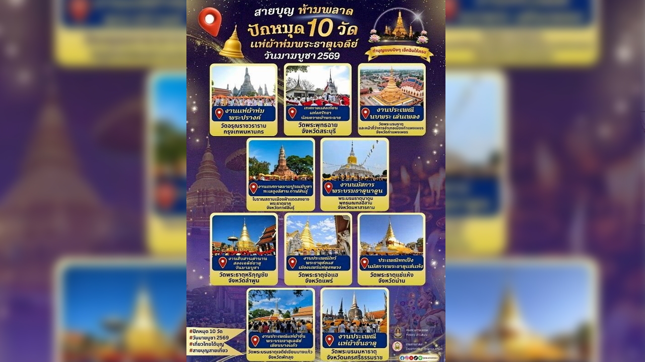 ทุกๆ ปีในช่วงเดือนกุมภาพันธ์จะมีเทศกาลสำคัญ 3 เทศกาลอยู่ในห้วงเวลาใกล้เคียงกัน และมักจะมีการจัดงานใหญ่ประชันกันและกันอยู่เสมอได้แก่ เทศกาลตรุษจีน เทศกาล วันวาเลนไทน์ หรือวันแห่งความรัก และเทศกาลงานบุญใหญ่ของชาวพุทธ วันมาฆบูชา...นั่นเองสำหรับปีนี้เนื่องจากเป็นปี “อธิกมาส” ปฏิทินจันทรคติ มี 13 เดือน โดยเดือน 8 จะมี 2 ครั้ง ได้แก่ 8 แรก และ 8 หลัง ทำให้ วันมาฆบูชา ซึ่งปกติจะตรงกับวันขึ้น 15 ค่ำ เดือน 3 เลื่อนออกไปเป็นวันขึ้น 15 ค่ำ เดือน 4 หลังตรุษจีนและวาเลนไทน์ไป 2 สัปดาห์เต็มๆ ตรงกับวันอังคารที่ 3 มีนาคมในปีนี้ (2569)ซึ่งก็ดีไปอย่างทำให้มีเวลาประชาสัมพันธ์เพิ่มมากขึ้น และไม่ต้องมาแย่งเนื้อที่ประชา สัมพันธ์กับเทศกาลตรุษจีน และวาเลนไทน์... โดยเฉพาะตรุษจีนปีนี้ ซึ่งเป็นปีครบรอบ 51 ปี สัมพันธ์การทูตไทย-จีน และนักท่องเที่ยวจีนได้หันเหกลับมาเที่ยวประเทศไทยเพิ่มขึ้นอีกครั้ง จึงมีการจัดงานฉลองอย่างยิ่งใหญ่บัดนี้เสียงกลองเสียงฉาบเสียงล่อโก๊วได้เงียบลงแล้ว จึงเป็นโอกาสที่เสียงกระดิ่งจากหลังคาพระอุโบสถต่างๆจะค่อยๆดังขึ้น เพื่อเชิญชวนพี่น้องชาวไทยกลับคืนสู่ความสงบเข้าวัดเข้าวาบำเพ็ญกุศลต่างๆในวันที่ 3 มีนาคม 2569 “วันมาฆบูชา” ของปีนี้ต่อไปเพื่อไม่ให้ตกเทรนด์ของการท่องเที่ยว “สายบุญ” (หรือบางท่านก็เรียกว่า “สายมู”) ทีมงานซอกแซกจึงขอใช้เนื้อที่คอลัมน์ในสัปดาห์นี้แนะนำ “10 สถานที่” ที่จะมีการจัดงานใหญ่ในเทศกาล มาฆบูชา เพื่อให้ท่านผู้อ่านรับรู้รับทราบ จะได้เตรียมตัวหาโอกาสเดินทางไปร่วมบุญได้อย่างทันท่วงทีและไม่ขาดตกบกพร่องเมื่อ 2 วันก่อนนี้เอง กรมการศาสนา กระทรวงวัฒนธรรม โดยท่านอธิบดี ชัยพล สุขเอี่ยม ได้แถลงเชิญชวนไว้ 10 วัดใน 10 จังหวัดทั่วไทยครบถ้วนทั้ง 4 ภาคและกรุงเทพมหานครที่จะมีการจัดงานใหญ่เนื่องในสัปดาห์มาฆบูชาดังนี้1.วัดอรุณราชวราราม กรุงเทพมหานคร จัดงาน “แห่ผ้าห่มพระปรางค์” ในวันที่ 3 มีนาคม 2569 (วันเดียว) ตั้งแต่เวลา 07.30 น. โดยจะมีพิธีเจริญพระพุทธมนต์ ตักบาตรพระสงฆ์ เวียนเทียน แห่ห่มผ้าพระปรางค์ และกิจกรรม Walk Rally ตามรอยสักการะสิ่งศักดิ์สิทธิ์ 5 จุดสำคัญของวัด2.เทศกาลแสงเทียนแห่งศรัทธา น้อมถวายผ้าพระฉาย วัดพุทธฉาย จังหวัดสระบุรี...ไฮไลต์พิธีเวียนเทียนรอบเขา 1,200 เมตร ระหว่าง 1-3 มีนาคม3.งานประเพณีนบพระ เล่นเพลง จังหวัดกำแพงเพชร ณ บริเวณที่ว่าการอำเภอเมืองกำแพงเพชร และ วัดพระบรมธาตุ ระหว่าง 27 กุมภาพันธ์ถึง 8 มีนาคม โดยจะมีกิจกรรมแสดงรำพุทธบูชานบพระบรมธาตุ และพิธีเวียนเทียนอย่างยิ่งใหญ่ในวันมาฆบูชา4.งานเทศกา