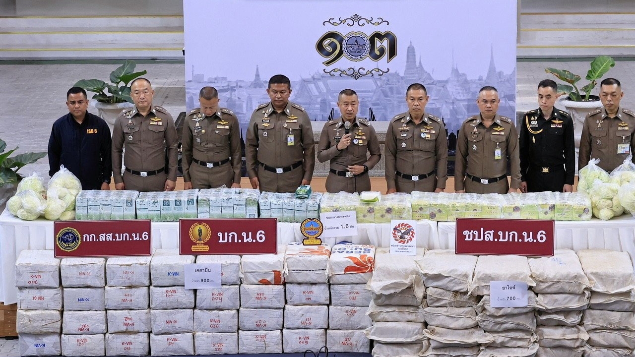 สืบนครบาล 6 ขยายผลยานรกเครือข่ายกำแพงแสน สะกดรอยจับหนุ่มพบพระขนยาเสพติดลอตมหึมายาไอซ์-คีตามีน รวม 1.6 ตัน คาปั๊มน้ำมันย่านบางปะอิน หลังซุกมากับรถกระบะมีคอกใช้กะหล่ำปลีอำพราง สอบสวนสารภาพรับจ้างในราคา 1 แสนบาท ทำมาแล้ว 3 หน อ้างเงินที่ได้นำไปรักษาลูกที่ป่วย ส่วนทางชายแดนภาคเหนือที่แม่อาย ทหารปะทะแก๊งขนยายิงสนั่นป่ากลางดึก ตกเช้าเข้าพิสูจน์ทราบพบเป้ใส่ยาบ้า 3 ใบ รวม 5 แสนเม็ดบช.น.ทลายหัวจ่ายยานรกรายใหญ่เครือข่ายกำแพงแสน เมื่อเวลา 11.00 น. วันที่ 6 เม.ย. ที่กองบัญชาการตำรวจนครบาล (บช.น.) พล.ต.อ.สำราญ นวลมา รอง ผบ.ตร. และ ผอ.ศอ.ปส.ตร. พล.ต.ท.สยาม บุญสม ผบช.น. พล.ต.ท.นพศิลป์ พูลสวัสดิ์ ผบช.ประจำ สนง.ผบ.ตร. พล.ต.ต.ธีรเดช ธรรมสุธีร์ รอง ผบช.น. พล.ต.ต.ชัยกฤต โพธิ์อ๊ะ ผบก.น.6 พ.ต.อ.นริศ ปรารถนาพร รอง ผบก.น.6 พ.ต.อ.เชิดศักดิ์ รอดเข็ม ผกก.สส.บก.น.6 ร่วมกับหน่วยข่าวกรองทางทหารกองทัพบก พล.ต.อภิชัย ทองธรรมชาติ ผบ.ขกท. ร่วมแถลงข่าวจับกุมนายตะวันฉาย แซ่เชอ อายุ 39 ปี ชาว อ.พบพระ จ.ตาก พร้อมของกลางวัตถุออกฤทธิ์ต่อจิตประสาทประเภท 2 (คีตามีน) น้ำหนักรวม 900 กก. ยาไอซ์น้ำหนัก รวม 700 กก. และรถกระบะโตโยต้า รีโว่ สีเทา ทะเบียน ผก 6831 พิษณุโลกพล.ต.อ.สำราญ นวลมา รอง ผบ.ตร. กล่าวว่า สืบเนื่องจากชุดสืบสวน กก.สส.บก.น.6 จับกุมแหล่งพักยาเสพติดรายใหญ่ ย่านกำแพงแสน จ.นครปฐม จับกุมผู้ต้องหา 3 ราย เมื่อวันที่ 5 มี.ค.ที่ผ่านมา พร้อม ของกลางยาคีตามีน 750 กก. ยาไอซ์ 665 กก. และ ยาบ้า 1,000,000 เม็ด จากการสืบสวนขยายผลทราบว่า ยังมีกลุ่มเครือข่ายขบวนการเดียวกันรับยาเสพติดมาจากประเทศเพื่อนบ้านตามแนวชายแดน ชุดจับกุม นำกำลังสะกดรอยเฝ้าสังเกตพฤติกรรมจนได้เบาะแส ขบวนการลำเลียงยาเสพติดใช้รถกระบะท้ายกระบะมีคอกเหล็กขนบรรทุกกะหล่ำปลีเต็มคันรถซุกยาเสพติด มาจากแนวชายแดน กระทั่งช่วงเช้าวันที่ 4 เม.ย. จับกุมนายตะวันฉายได้ที่ปั๊มน้ำมันแอลพีจี ซันนี่ ต.เชียงรากน้อย อ.บางปะอิน จ.พระนครศรีอยุธยา พร้อมยาเสพติดของกลางใส่ถุงชาอู่หลงบรรจุในลังกระดาษซุกซ่อนในกองผักปิดทับอำพรางเอาไว้ สอบสวนรับสารภาพว่า มีผู้ว่าจ้างขับรถยนต์ขนยาเสพติด ครั้งละ 100,000 บาท เงินที่ได้นำไปรักษาลูกที่ป่วย โดยรับจ้างขนยาเสพติดมาแล้ว 3 ครั้ง โดย 2 สัปดาห์ขนครั้งหนึ่งพล.ต.อ.สำราญกล่าวอีกว่า จากการสืบสวนพบว่ายาเสพติดลำเลียงจากประเทศเพื่อนบ้านเข้ามา ทาง อ.พบพระ จ.ตาก ลักลอบขนลำเลียงเข้ามาพักไว้ พื้นที่ จ.ปทุมธานี และ จ.พระนครศรีอยุธยา ก่อนส่ง ให้ลูกค้า สั่งการให้ชุดสืบสวนขยายผลจับกุมยาเสพติดลอตที่เล็ดรอดไปได้ ตรวจสอบประวัติผู้ต้องหาไม่พบ ประวัติการก