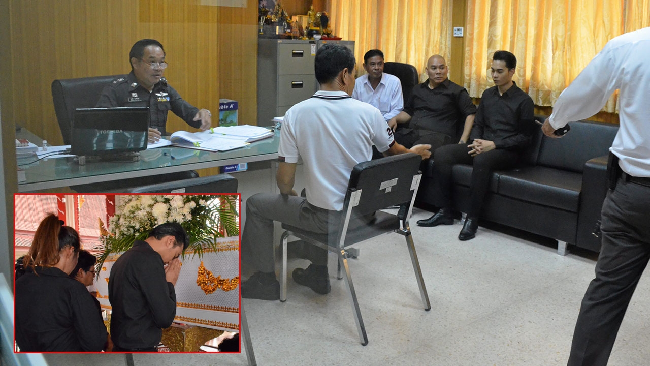 นายชูศักดิ์ เอี่ยมสุข หรือโหน่ง ชะชะช่า พานายกิติภูมิ หรือเดียร์ เอี่ยมสุข ลูกชาย เข้าพบตำรวจ สภ.ธัญบุรี เพื่อสอบปากคำคดีขับรถเก๋งชนกันทำให้นายพรพิชิต นฤนาทมนตรี วิศวกรคู่กรณีเสียชีวิต ขณะที่นายกิติภูมิ (รูปเล็ก) ยกมือไหว้ขมาต่อหน้าโลงศพในพิธีฌาปนกิจนายพรพิชิต ที่วัดอัยยิการาม จ.ปทุมธานี บรรยากาศเป็นไปอย่างโศกเศร้า.