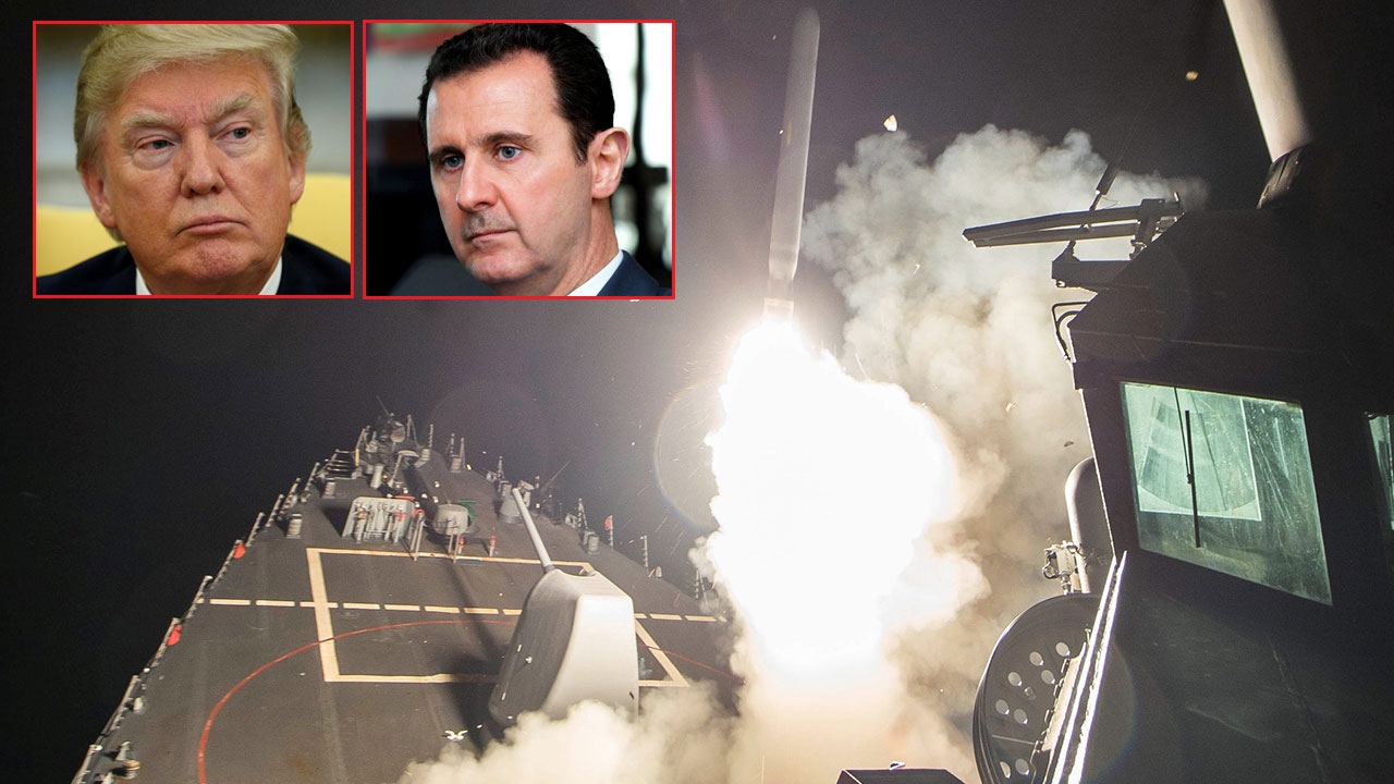 เรือรบสหรัฐอเมริกาที่ลอยลำในทะเลเมดิเตอร์เรเนียนยิงขีปนาวุธจรวด “โทมาฮอว์ก” ถล่มฐานทัพซีเรียตามคำสั่งนายโดนัลด์ ทรัมป์ ผู้นำสหรัฐฯ (ซ้าย) ตอบโต้กองทัพซีเรีย ที่นำโดยนายบาชาร์ อัล-อัสซาด ผู้นำซีเรีย (ขวา) ซึ่งถูกกล่าว หาใช้อาวุธเคมีแก๊สซารีนถล่มใส่กบฏจนมีผู้เสียชีวิต 86 ศพ.