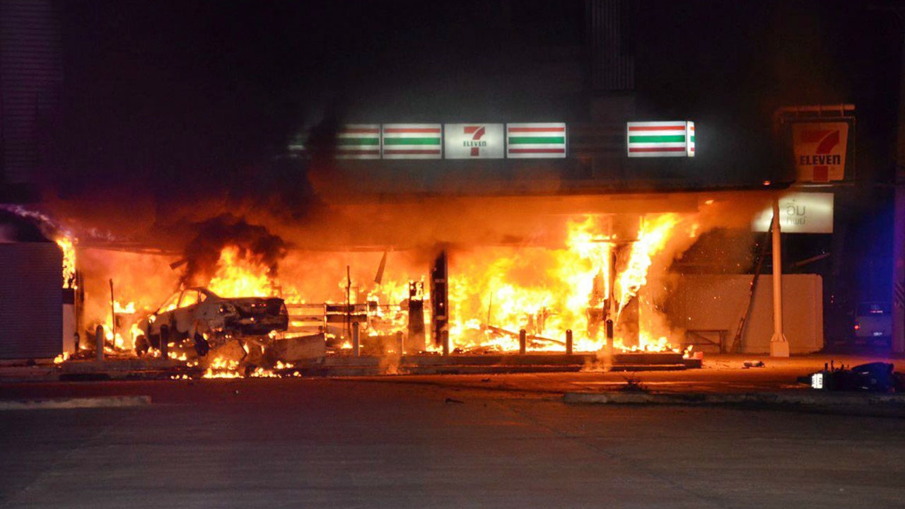 ภาพเหตุการณ์เพลิงโหมลุกไหม้ร้านเซเว่นฯ ริมถนนสายปทุมธานี-เสนา หมู่ 1 ต.สามโคก อ.สามโคก จ.ปทุมธานี หลังนายธนวีร์ ธนาโชติช่วง อายุ 49 ปี เสี่ยเจ้าของบ้านจัดสรร ซิ่งเก๋งนิสสันเทียน่าโฉมใหม่ เสียหลักพุ่งชนขอบทางกลับรถกับป้ายบอกทาง ก่อนปีนขึ้นฟุตปาทพุ่งชนร้านอย่างจังจนเพลิงลุกไหม้คลอกคนขับเจ็บสาหัส.