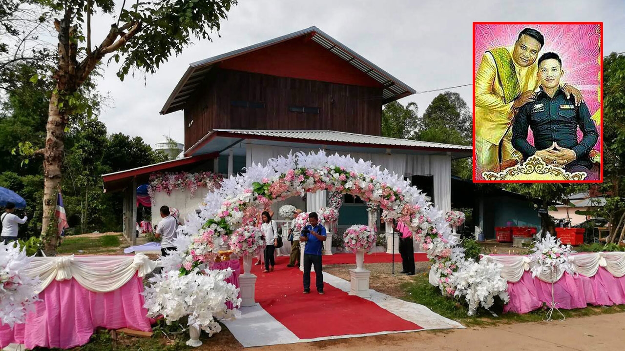 บ้านพ่อแม่ ส.ต.ต.ธนเดช สุขทวินันท์ จราจร สภ.วังน้อย ใน อ.จตุรพักตรพิมาน จ.ร้อยเอ็ด จัดซุ้มดอกไม้ประดับสวยงาม ขณะทำพิธีแต่งงานระหว่าง ส.ต.ต.ธนเดช กับนายณัฐวุฒิ สานนท์ (รูปเล็ก) มีญาติร่วมแสดงความยินดี.