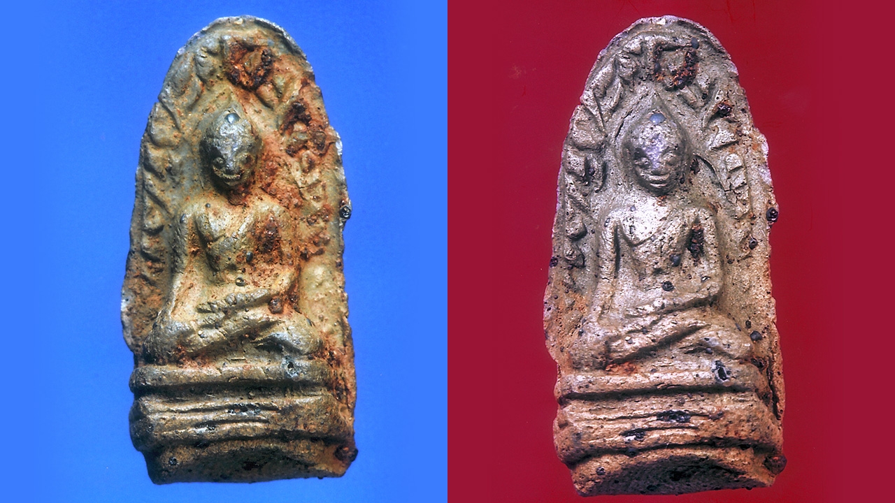 พระรอดเขียว ...พิมพ์ใหญ่องค์เดียวกันนี้ สภาพต่างกัน เพราะถูกถ่ายภาพไว้คนละเวลา องค์หนึ่งเกรอะกรังด้วย คราบกรุสีน้ำตาลเข้ม ทั้งเป็นก้อน เป็นปื้นหนา-บาง อีกองค์ค่อนข้างเกลี้ยงเกลา เพราะล้างคราบออกไปแล้วคราบ...พระรอด หรือพระลำพูนทั่วไป คล้ายกัน นักขุดพระมักเจอพระรอดในชั้นดินหรดาล และในจุดที่เจอซากปูนทรายจากสถูปเจดีย์เก่าที่มักมีคราบน้ำ “ฮาก” ผสมจนติดเกรอะกรังถ้าพระเนื้อดิน เผาไฟอ่อน คราบจะจับลึกเข้าในเนื้อในผิว ล้างไม่ดีผิวจะเสียแต่ถ้าเป็นพระเผาไฟแก่ เนื้อออกแดงเข้ม ปริ่มเขียว หรือเขียวตลอดองค์ พระผิวนี้มักตึงแน่น...ถ้าเขียวคล้ำ ผิวทำท่าจะละลาย นึกถึงผิวโอ่งมังกรราชบุรี...คราบน้ำฮากแค่จับติด พอหาวิธีเอาออกได้ไม่ยากเกินไปโจทย์ พระรอดเนื้อเขียว ไฟแก่จนผิวใกล้ละลาย แต่คราบเกรอะกรังปิดบังเส้นสายลายพิมพ์ และบางจุดที่เป็นตำหนิสำคัญ โอกาสที่จะเอาคราบออกพอมี แต่ต้องใช้วิชาคุณเชียร ธีระศานต์ ล้างพระซุ้มกอพิมพ์ใหญ่...องค์ที่มีคราบรารักจับดำทั้งองค์ ถอดรูปเจ้าเงาะออกเป็นพระสังข์ทอง เป็นซุ้มกอองค์ครู ที่ทำราคาล้าน องค์แรกในวงการพระเครื่อง ใช้มือเบาแสนเบา ล้างซ้ำแล้วซ้ำเล่า 11 ครั้งพระซุ้มกอ เนื้ออ่อน เพราะเผาไฟอ่อน...เผาแบบเผามัน เปลือกไหม้ไส้ดิบ พระทุ่งเศรษฐีทุกองค์ที่หัก เนื้อในสีดำ เหมือนไส้ขนมเปี๊ยะ ตอนล้างต้องเบามือให้มากๆแต่ในกรณีที่เป็นพระรอดเนื้อเขียว เนื้อถูกไฟแก่ผิวใกล้ละลาย...แม้จะใช้มือหนักได้มากกว่าพระซุ้มกอ แต่ก็ต้องระวัง จิ้มน้ำยา (สมัยคุณเชียรใช้ยี่ห้อโอไบรท์) ด้วยปลายไม้จิ้มฟัน ค่อยๆจิ้ม และขยี้ไปเรื่อยๆคราบกรุที่ดูจะติดแน่นมาก จะค่อยๆ กระจาย นี่เป็นกรณีคราบแท้แต่ถ้าเป็นคราบเทียม ซึ่งก็ทำได้สีสันใกล้เคียง แต่ไม่ยึดเกาะผิวพระมาก ไม่ต้องใช้น้ำยาเป็นตัวช่วย แช่น้ำใช้แปรงปัด ก็มักหลุดร่อนไปได้ง่ายๆคราบพระรอดเขียวองค์นี้...เท่าที่เห็นจากองค์ก่อนล้าง...ไม่มากนัก ใช้เวลามากกว่า 5 ชั่วโมงเหลือบางจุด เจตนาให้ติดเกรอะไว้ เป็นกรณีศึกษา คราบกรุมหาวันแท้ เป็นเช่นนี้ผลที่ได้คือ พระรอดเขียว สีมะกอกสุก องค์งามตา เส้นสาย ตำหนิเล็กน้อย เปิดออกมาให้เห็นชัดเจนแต่ต้องเข้าใจ ตำหนิพระรอดทุกจุด ของปลอมทำออกมานาน เส้นสายแม้จะแข็งๆไปบ้าง แต่ก็ใกล้เคียงเต็มทีในทรรศนะผม จุดชี้ขาดพระรอดมหาวันแท้ แม่พิมพ์ตำหนิพิมพ์ แม้จะต้องมาก่อน ก็จริง แต่เนื้อพระ ธรรมชาติความเก่าของพระเป็นข้อชี้ขาดถ้าพิมพ์ใช่ แต่เนื้อไม่ใช่ คราบราไม่มีเป็นตัวช่วย ธรรมชาติไม่ไปก็ต้องยั้งมือพระรอดแท้ แต่ละ