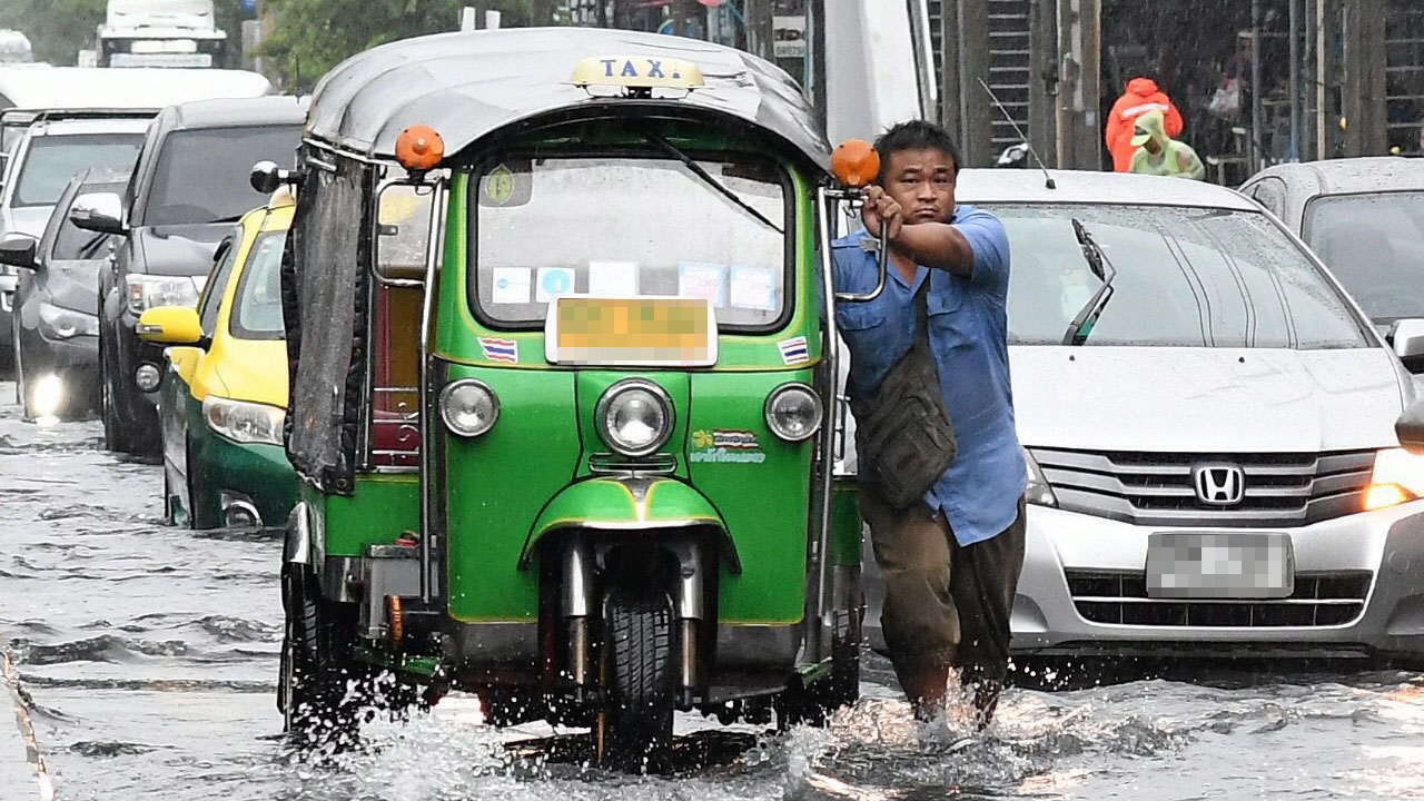 คนขับรถตุ๊กตุ๊กต้องลงมาเข็นรถลุยน้ำ บริเวณแยกพงษ์เพชร ถนนงามวงศ์วาน เขตหลักสี่ กทม. อย่างทุลักทุเล เพราะเครื่องยนต์ดับ หลังฝนตกหนักแค่ชั่วโมงเดียว ทำให้น้ำท่วมถนนราวกับคลอง ส่งผลให้มีรถยนต์เครื่องดับหลายคัน.