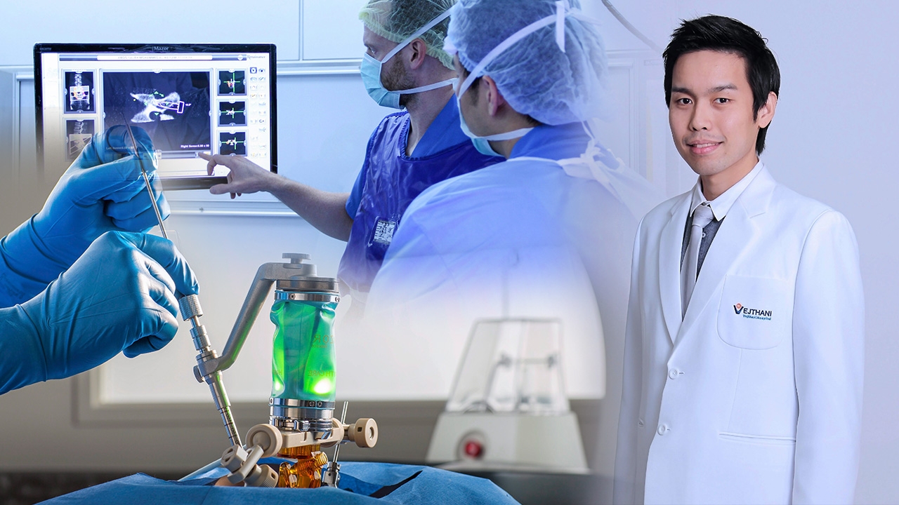 นวัตกรรมทางการแพทย์ที่ทันสมัย มีส่วนช่วยคุณภาพชีวิตของคนยุคนี้ให้ดีขึ้น ในอดีตการผ่าตัดกระดูกสันหลัง ถือเป็นเรื่องใหญ่ เพราะมีความซับซ้อน ส่วนหลังของคนเรา นอกจากมีกระดูกสันหลังแล้ว ยังมีเส้นประสาทที่สำคัญ รวมถึงเส้นเลือดแดงและเส้นเลือดดำใหญ่ด้วย ปัจจุบันมีนวัตกรรมทางการแพทย์ช่วยเพิ่มความแม่นยำในการผ่าตัดกระดูกสันหลัง ซึ่ง นพ.ภัทร โฆสานันท์ ศัลยแพทย์กระดูกและข้อ เฉพาะทางด้านโรคกระดูกสันหลัง โรงพยาบาลเวชธานี เปิดเผยว่า การผ่าตัดกระดูกสันหลังในปัจจุบัน มากกว่าครึ่งหนึ่งจะมีการใส่อุปกรณ์เข้าไปในกระดูกสันหลัง ซึ่งอุปกรณ์ที่ใส่เข้าไปจะเป็นสกรู การใส่สกรูในกระดูกสันหลังในตำแหน่งที่ดีค่อนข้างลำบาก เพราะบริเวณกระดูกสันหลังที่สามารถฝังสกรูเข้าไปได้ และไม่เป็นอันตรายต่ออวัยวะสำคัญอื่นๆ จะค่อนข้างเล็ก มีพื้นที่ใหญ่กว่าตัวสกรูไม่ถึง 1 มิลลิเมตร หากศัลยแพทย์ไม่มีความชำนาญ อาจเกิดความผิดพลาด ทำให้ผู้ป่วยต้องเป็นอัมพาตได้ แพทย์ผู้เชี่ยวชาญได้อธิบายต่ออีกว่า นวัตกรรมทางการแพทย์ปัจจุบัน การผ่าตัดกระดูกสันหลังไม่น่ากลัวอีกต่อไป ด้วยหุ่นยนต์ช่วยผ่าตัดกระดูกสันหลังเรเนซองส์ ที่ได้รับการรับรองจาก องค์การอาหารและยาแห่งสหรัฐอเมริกา (FDA) เป็นหุ่นยนต์ผ่าตัดกระดูกสันหลังตัวแรกของโลก ที่จะเป็นตัวช่วยของศัลยแพทย์ผู้ผ่าตัด ให้สามารถวางแผนการผ่าตัดได้อย่างมีประสิทธิภาพมากขึ้น เพราะแพทย์จะรู้ตำแหน่ง และรายละเอียดของกระดูกสันหลังของผู้ป่วย ในทุกตำแหน่งและทุกมิติที่ใส่สกรู ซึ่งหุ่นยนต์จะช่วยลดความผิดพลาดได้มากถึง 99.7% ในการทำงาน แพทย์จะใช้ข้อมูลจาก CT-Scan ร่วมกับภาพจากการเอกซเรย์จริงในห้องผ่าตัด ใส่เข้าไปประมวลผลในคอมพิวเตอร์ของหุ่นยนต์ หลังจากนั้นแพทย์จะออกแบบการใส่สกรูที่กระดูกสันหลังในคอมพิวเตอร์ ซึ่งหุ่นยนต์จะช่วยในการหาตำแหน่งปักสกรูบริเวณสันหลังของผู้ป่วย ตามที่วางแผนเอาไว้ อย่างไรก็ตาม แม้หุ่นยนต์ซึ่งถือเป็นเทคโนโลยีขั้นสูงสุดในปัจจุบัน แต่ความสำเร็จในการผ่าตัดนั้น ยังจะต้องประกอบไปด้วยประสบการณ์ และความชำนาญของศัลยแพทย์ด้วยเช่นกัน เนื่องจากแพทย์จะเป็นผู้พิจารณาวางแผนการผ่าตัด ตรวจสอบความถูกต้องของหุ่นยนต์ นอกจากเทคโนโลยีหุ่นยนต์แล้ว รพ.เวชธานี ยังมีนวัตกรรมที่ช่วยเพิ่มระดับความปลอดภัยขั้นสูงสุด คือ O-Arm ที่สแกนแนวกระดูกสันหลังของผู้ป่วยแบบ 3 มิติ เพื่อให้มั่นใจได้ว่า สกรูทุกตัวที่ศัลยแพทย์ใส่เข้าไปให้คนไข้ จะอยู่ในตำแหน่งที่ดีที่สุดและปลอดภัยที่สุดอี