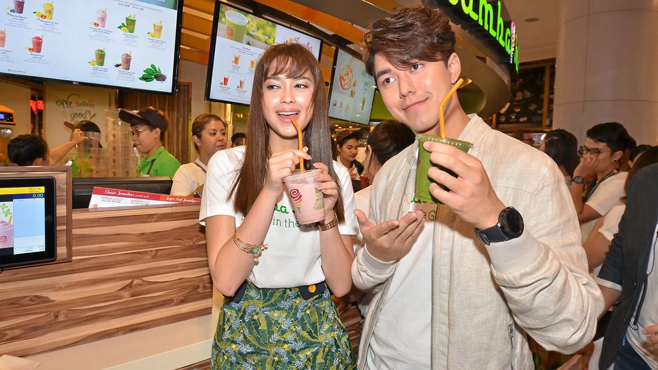 มันจะเฟรชๆหน่อย ...เมื่อพระเอกสุดฮอต นาย-ณภัทร จูงมือนางเอกสาว แพทริเซีย กู๊ด มาเผยเคล็ด (ไม่ลับ) การเลือกเครื่องดื่มเพื่อเพิ่มความสดชื่นระหว่างวัน ในงานฉลองเปิดตัว แจมบาร์ จูซ (Jamba Juice) แบรนด์เครื่องดื่มสมูทตี้น้ำผักและผลไม้สดจากธรรมชาติ อันดับ 1 จากอเมริกา นำเข้าโดย ดร.อุษณีย์ มหากิจศิริ ลีโอณีโอ พร้อมแจกความสดชื่นให้แฟนๆ ได้ลิ้มลองความหวานที่ได้จากผลไม้สดแท้ๆ ทำเอาใครๆต่างติดใจมารอต่อคิวชิมน้ำผักผลไม้กันจนแถวยาวเหยียด ณ บริเวณร้านแจมบาร์ จูซ ชั้น G พารากอน ฟู้ด ฮอลล์ ศูนย์การค้าสยามพารากอน.