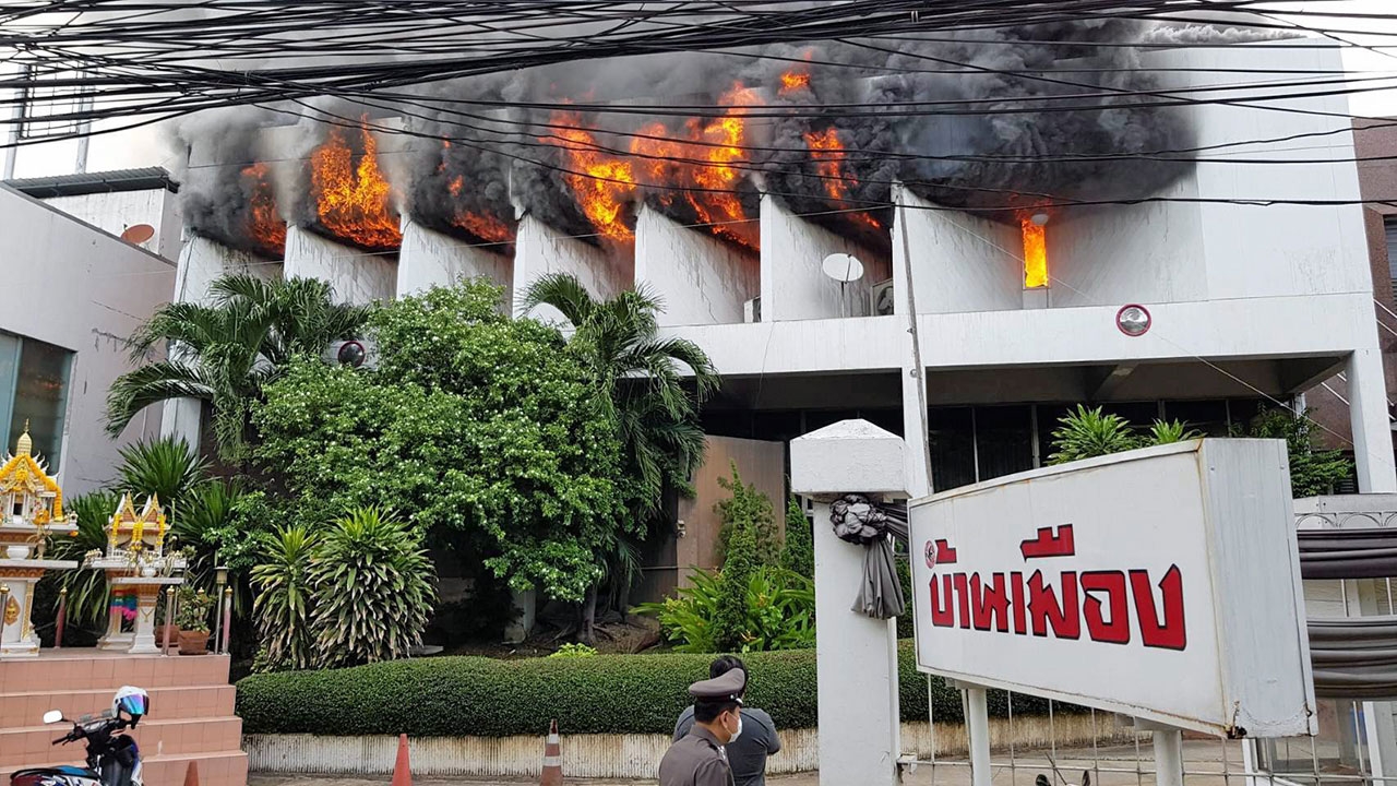 ภาพเปลวเพลิงพวยพุ่งออกมาจากอาคารสำนักงานหนังสือพิมพ์บ้านเมือง ริมถนนวิภาวดีรังสิต เมื่อเช้าตรู่วันที่ 19 มิ.ย. เจ้าหน้าที่ ใช้เวลาควบคุมเพลิง 1 ชั่วโมงกว่า ไร้เจ็บตาย ส่วนสาเหตุคาดเกิดจากคอมเพรสเซอร์แอร์ระเบิด ตำรวจห้ามใช้อาคารชั่วคราว รอให้ทาง กทม.เข้ามาตรวจสอบ.