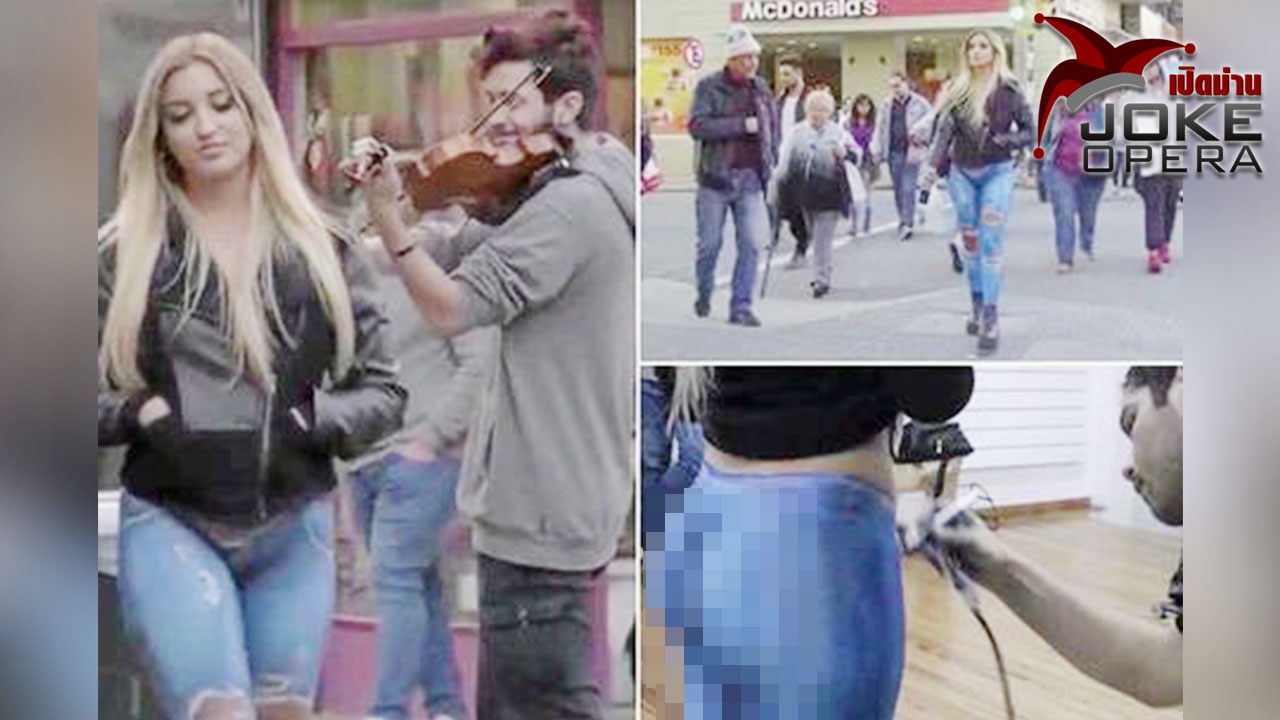 มีการทดสอบว่า “สังคมชาวอุรุกวัยไขว้เขวว้าวุ่นฉันบ้าง?” โดยใช้นางแบบสาวสวยเซ็กซี่ผมสีบลอนด์ทอง แต่งกายชุดท่อนล่างนุ่งกางเกงลิง “จี-สตริง” ตัวเดียวเดินชมเมืองคลิปวีดิโอโชว์โมเดลสาวสะคราญหุ่นสะบึมบั้นท้ายดินระเบิดนาม “จีเม เจโลส” ให้ศิลปินบรรจง “เพนต์” ใช้สีน้ำเงินวาดร่างกายท่อนล่างเหมือนกับเธอนุ่งกางเกงยีนส์ขายาวรัดรูปตึงเปรี๊ยะ ส่วนท่อนบนสวมเสื้อแจ็กเกตของจริง ออกไปเดินนวยนาดวางมาดกิ๊บเก๋ปะปนกับประชาชนสาวจีเมเดินตามถนนตรอกซอกซอยกลางกรุงมอนเตวิเดโอ ขึ้นรถเมล์ เข้าคิวรอซื้ออาหาร “ฟาสต์ฟู้ด” จานด่วน เข้าชมสินค้าเสื้อผ้าในร้าน ขณะที่ตากล้องบันทึกภาพปฏิกิริยาท่าทีผู้คนดูเหมือนประชาชีส่วนใหญ่มิได้สังเกตและไม่รู้ว่าท่อนล่างเธอสวมเพียงกางเกงลิงตัวกระจิ๊ดปิดจุดยุทธศาสตร์ โดยไม่ได้สวมใส่กางเกงยีนส์ดังปรากฏในสายตา มีแค่ผู้หญิงสาวใหญ่นางหนึ่งเบิ่งตามองซ้ำสองด้วยท่าทางสงกะสัยในร้านอาหารฟาสต์ฟู้ดแมคโดนัลด์ผลงานชุดนี้ผลิตโดย ฮาเวียร์ อายูล และช่างภาพ เฟบรี เลมูส ทีม งานของยูทูบ เผยแพร่สู่โซเชียลมีเดีย ดึงดูดท่าน ผู้ชมได้กว่าสองล้านวิว เลยทีเดียวเชียวแหละ.ดอย ดอกฝิ่น