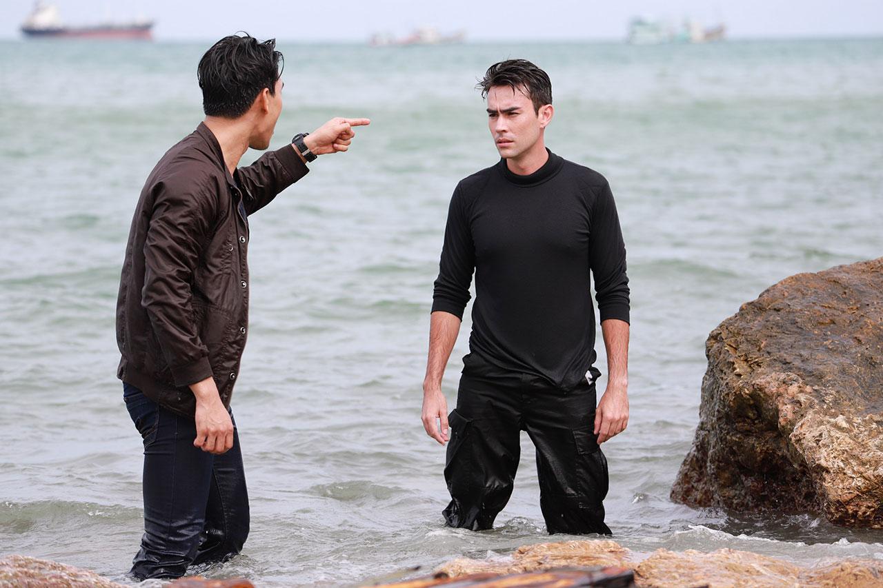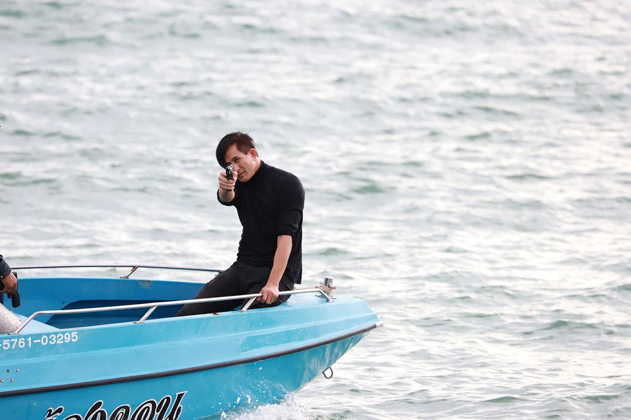 เบื้องหลังฉากนี้เรียกได้ว่านักแสดงเข้าฉากกันเกือบยกทีม ถือว่าเป็นอีกหนึ่งฉากใหญ่ เพราะต่อสู้กันบนบกแล้วยังมีการยิงต่อสู้บนเรือกลางทะเลอีก แต่ที่รับบทหนักสุดเห็นจะเป็น หลุยส์และโอ๊ต ที่ต้องกระโดดหนีระเบิดลงทะเล ซึ่งทั้งคู่เล่นเองไม่ใช่สแตนอิน! งานนี้สองหนุ่มเขาทุ่มสุดตัวจริงๆ