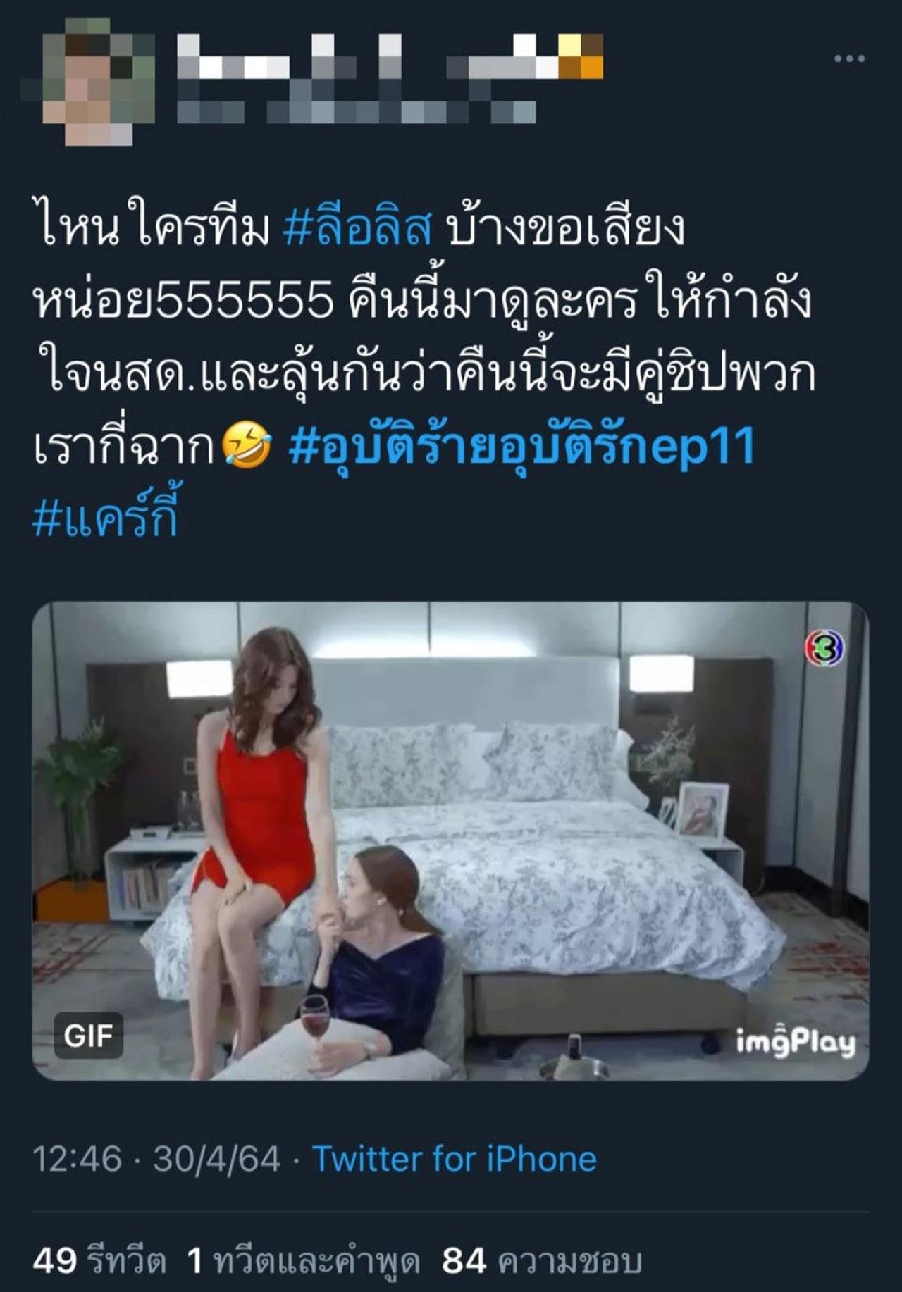 แต่สิ่งที่ทำให้คนดูคลั่งหนัก และทำให้ตัวละครคุณลี มีกระแสปังเว่อร์ได้ขนาดนี้ นั่นก็เกิดจากการเปิดปมความลับของตัวละคร ลี ว่าเธอได้คบหากับผู้หญิงที่ชื่อ “อลิส” รับบทโดย “แจ็คกี้ ชาเคอลีน มึ้นช์” ถือได้ว่าเป็นการพลิกบทบาทครั้งสำคัญของสาวแคร์เลย ที่เธอต้องเป็นเลสเบี้ยน แต่ฝีมือการแสดงของเธอก็ออกมาดีเกินคาด จนแฟนๆ แห่ชมไม่หยุด แถมยังบอกว่ามีความหลัว (สามี) มาก และด้วยเหตุที่ “แคร์” กับ “แจ็คกี้” ได้ปล่อยสกิลการแสดงอินเลิฟของคู่รักเลสเบี้ยนออกมาได้แบบถึงใจแฟนๆ ทำให้ทุกคนต่างจิ้นคู่ “ลี-อลิส” หนักมาก