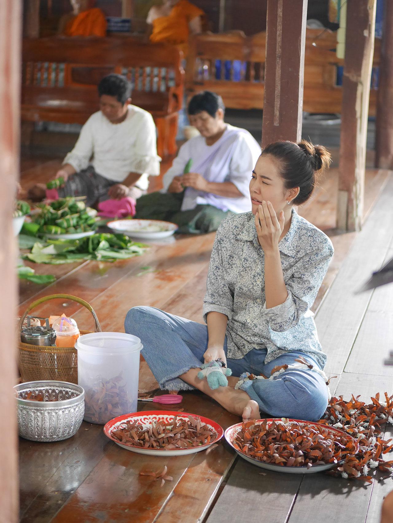 ในฉากนั้น วันเตรียมงาน ณเดชน์ คูกิมิยะ (เขียว) ไม่ได้มาร่วมงานเพราะเพิ่งเดินทางกลับมาจากกรุงเทพฯ มาอยู่บ้านหนองกะแยง ซึ่งพอวันรุ่งขึ้น น้ำฝน สรวงสุดา ซึ่งรับบทเป็นแม่ จึงชวนให้ณเดชน์ มาฟังเทศน์ด้วยกัน แต่ด้วยความที่ณเดชน์นั้น ยังไม่อินกับบรรยากาศของงานบุญของหมู่บ้านนัก งานนี้เลยทำให้เจ้าตัวนั่งหลับไปตามระเบียบ ขณะที่พระกำลังเทศน์