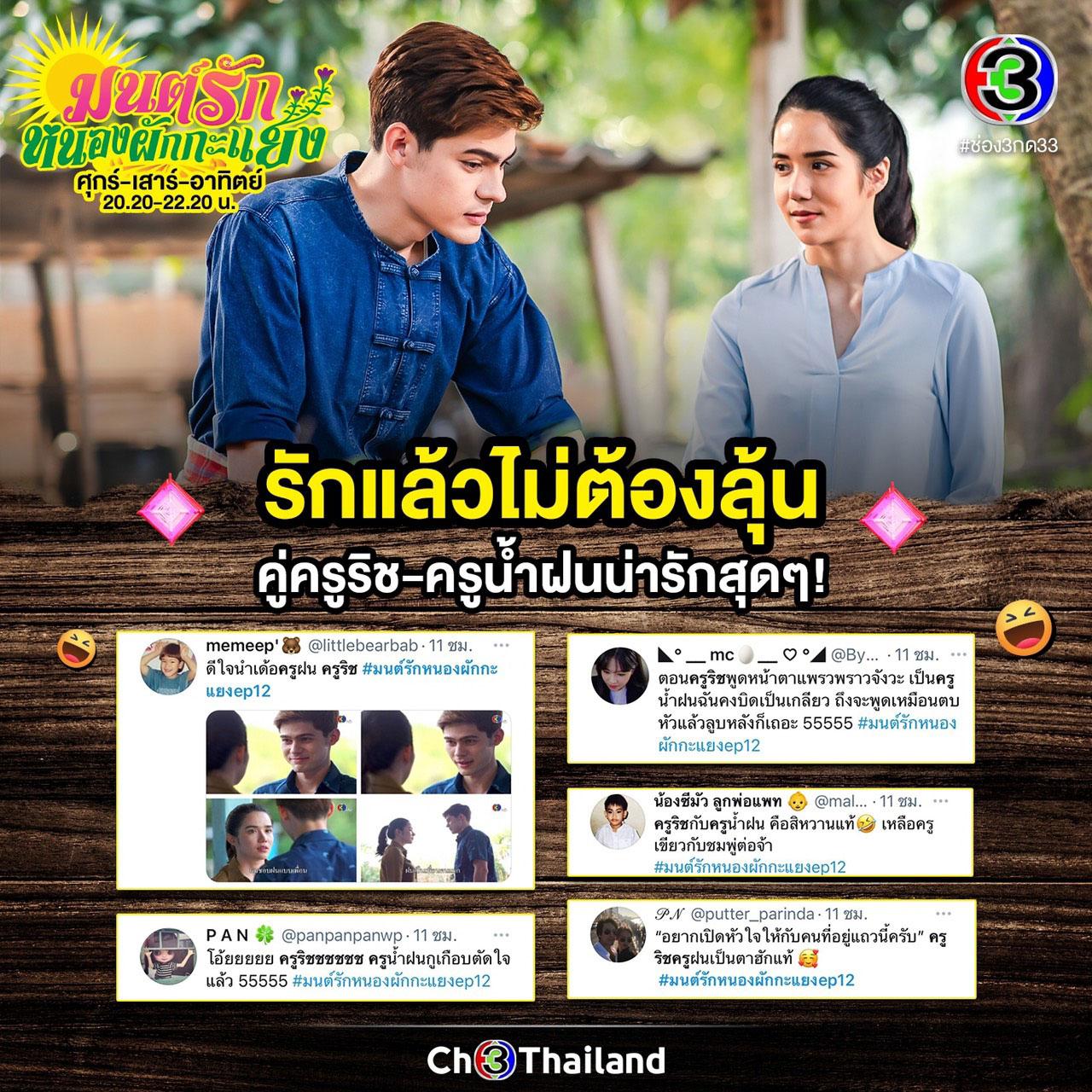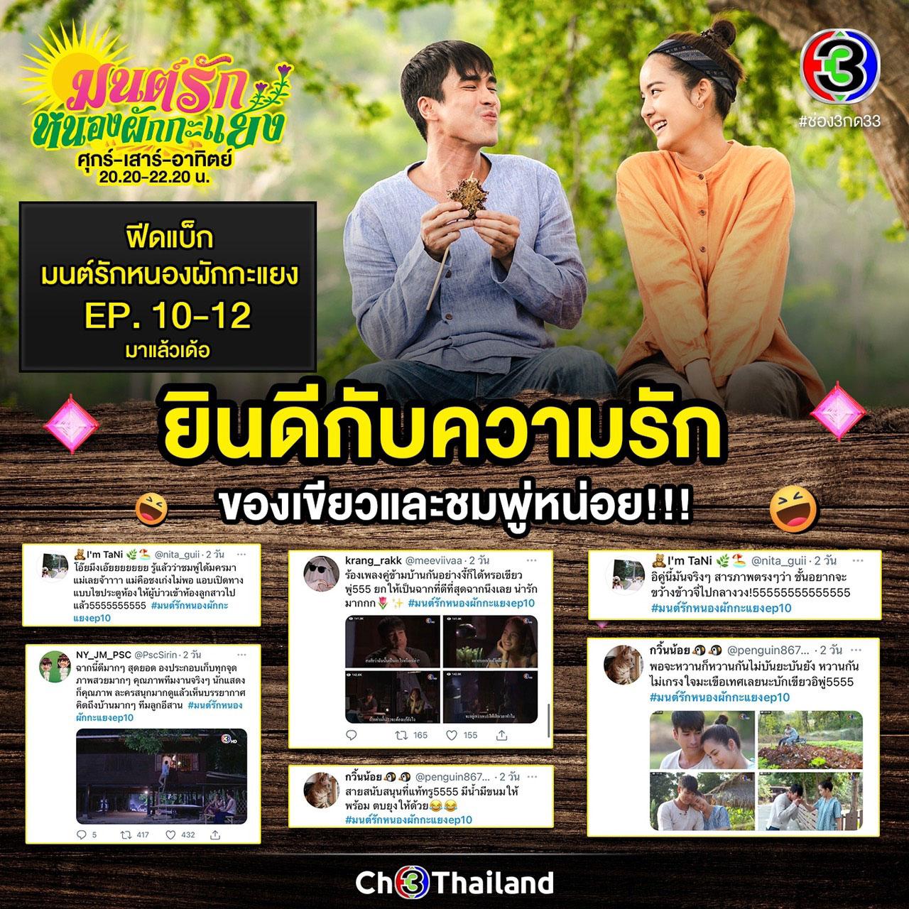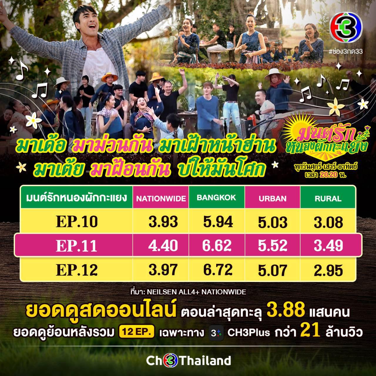 แรงดีไม่มีตก สำหรับละครฟีลกู๊ด “มนต์รักหนองผักกะแยง” ทาง ช่อง 3 กด 33 ค่าย ดู เอ็นเตอร์เทนเมนท์ โดยเฉพาะช่วงโค้งสุดท้าย 3 ตอนล่าสุดที่ผ่าน “บักเขียว” (ณเดชน์ คูกิมิยะ) จับมือ ชมพู่ (โบว์ เมลดา) โกยเรตติ้งพุ่ง โดยเฉพาะในคืนเสาร์ EP 11 ฟาดเรตติ้งทั่วประเทศไปถึง 4.40 คืนวันอาทิตย์ EP 12 เรตติ้ง กรุงเทพฯ-ปริมณฑล พุ่งไปถึง 6.72 ยอดคนดูสดออนไลน์ในตอนล่าสุดทะลุ 3.88 แสนคน ยอดคนดูย้อนหลังรวม 12 EP เฉพาะทาง CH3Plus กว่า 21 ล้านวิว