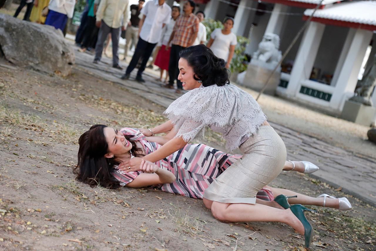 เบื้องหลังฉากนี้ ทีมงานยกกองไปถ่ายทำกันที่วัดเฉลิมพระเกียรติ จังหวัดนนทบุรี เป็นซีนใหญ่ๆ อีกซีนของเรื่อง เพราะงานนี้ในวัดในวาเราก็ไม่สนเพราะขอเนรมิตให้เป็นลานมวยของหนุ่มๆ โอม เคลลี่ และลานตบของบรรดาเมีย อย่าง แคท กับ แพร และแน่นอนด้วยความที่เป็นซีนใหญ่ นักแสดงก็เรียกได้ว่าขนกันมาเกือบทั้งเรื่อง ทั้ง หนุ่มซัน และหนุ่มเขต ที่ในเรื่องอาสามาเป็นลูกมือให้เคลลี่ ส่วนฟ้าใสและหนุ่มเบนซ์ ขออาสามาเป็นลูกมือให้โอม และด้วยทั้งเคลลี่และโอมต้องถอดเสื้อลงน้ำมันโชว์หุ่นเป๊ะ ยิ่งออกลีลาชกต่อย ฟาดเตะ บอกเลยว่าทั้งเท่ ทั้งเซ็กซี่มาก จนทำให้นักแสดงหญิง อย่าง แคท มิว แพร จอย ยืนกรี๊ดๆ กันข้างสนามจนลืมไปว่า เราก็ต้องดวลตบเหมือนกัน แต่เรื่องตบคู่นี้เขาหายห่วง เพราะเคยปะทะฝีมือกันมาแล้วหนึ่งรอบ แต่ด้วยชุดของสองสาว กระโปรงที่แคบ ก็แอบเป็นอุปสรรคเบาๆ แต่งานนี้ผู้กำกับอย่าง ปกาสิต กิ่งศักดิ์ บอกเชื่อมือในนักแสดงทุกคนเพราะมืออาชีพกันจริงๆ เมื่อซ้อมคิวเป๊ะ
