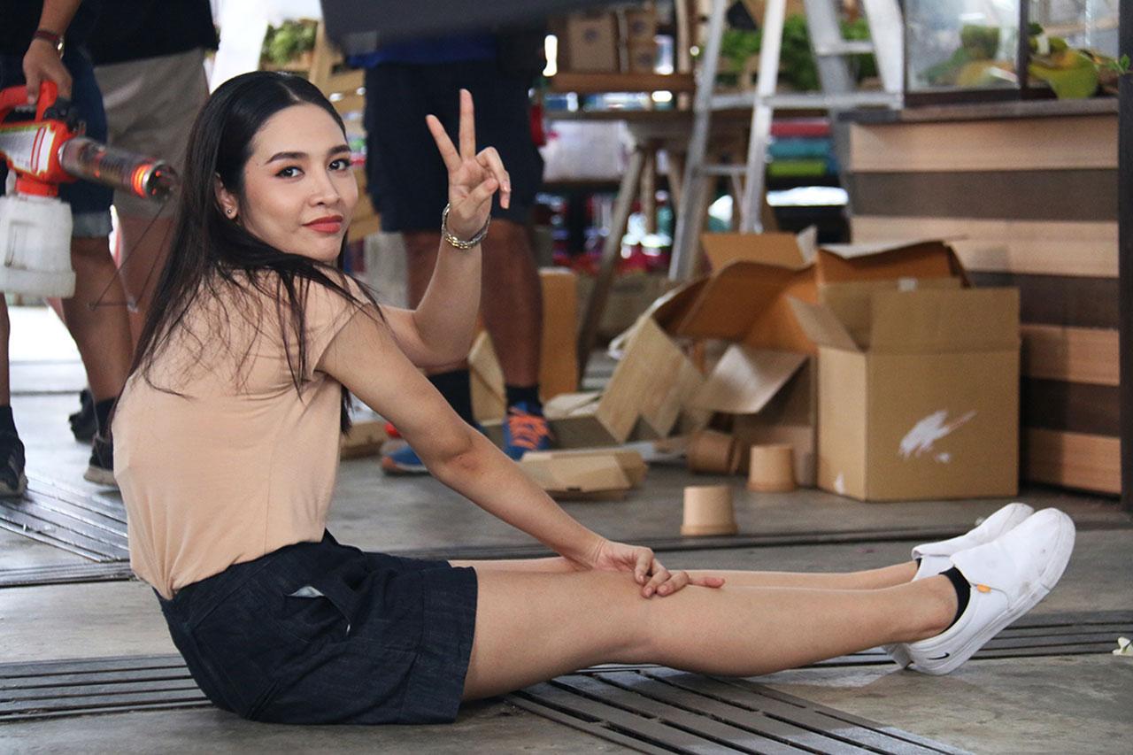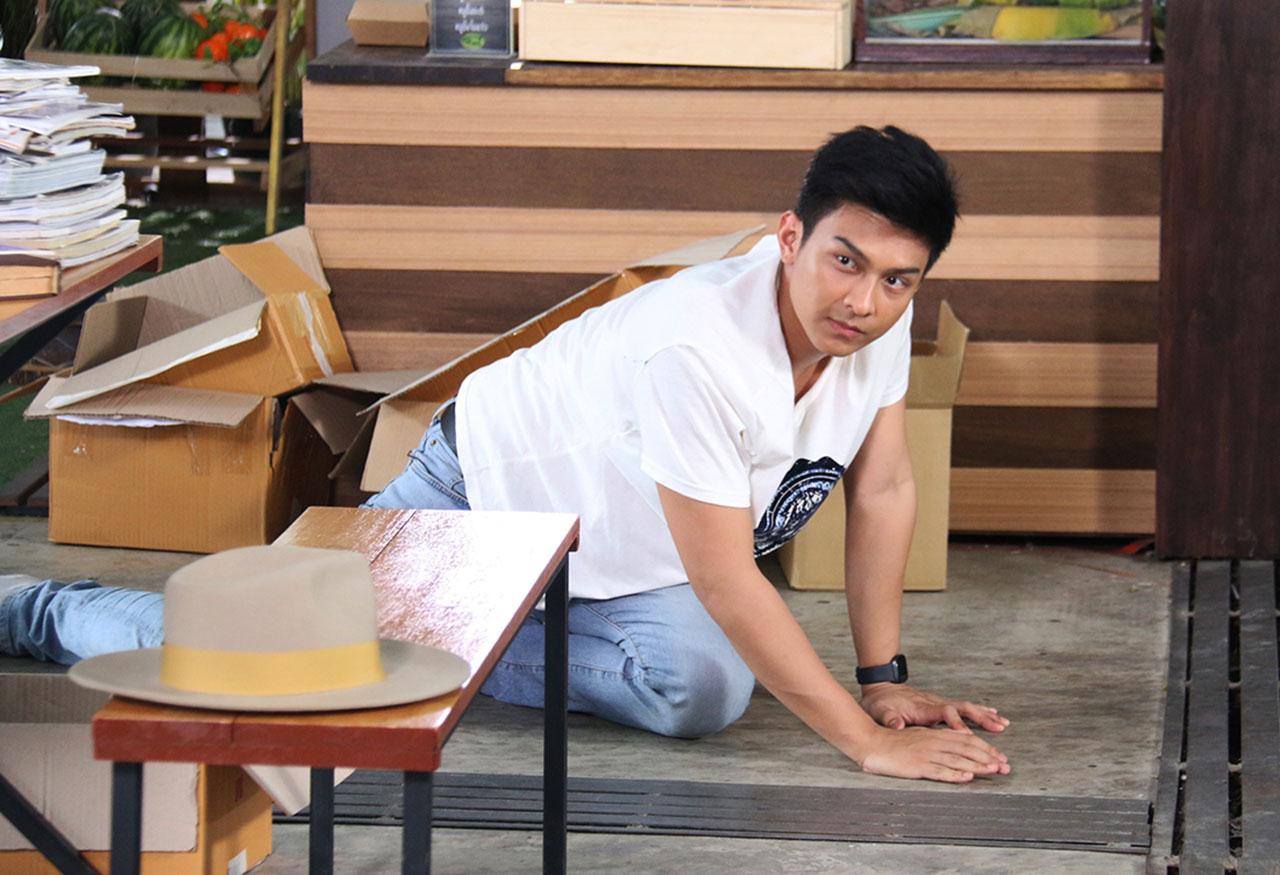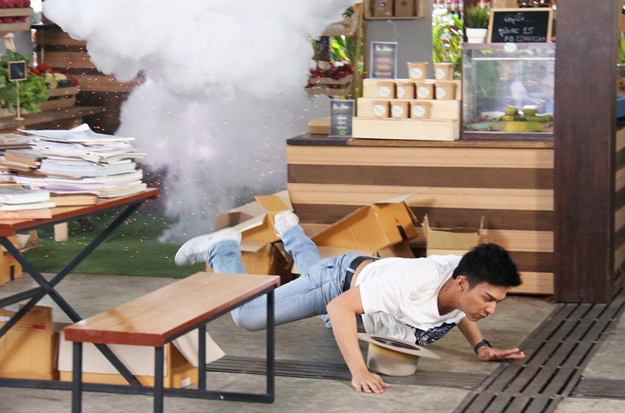 ฉากนี้ปักหลักถ่ายทำกันที่ตลาดบัวทอง ย่านนนทบุรี พี่เบิร์ด-ภูมิภัทร ผู้กำกับฯ นัดทีมงานแต่เช้าตรู่เพื่อเตรียมความพร้อม หลังจากซ้อมคิวเอฟเฟกต์ระเบิดจนมั่นใจว่าไม่พลาด พี่เบิร์ดก็เรียก โหน-จีน-ไบร์ท-พลอย มาซ้อมบล็อกกิ้งอีกครั้งเพื่อความชัวร์ พี่เบิร์ดเริ่มถ่ายคัทที่หม่อนดึงบี๋ให้หลบระเบิดจนกลิ้งไปพร้อมกันตามด้วยคัทที่หนูรุ้งล้มกลิ้งไปที่พื้น งานนี้ จีน-ไบร์ท-พลอย สปิริตสุดๆ ล้มจริง กลิ้งจริงแบบไม่ใช้สแตนด์อิน มาถึงคัทที่เยี่ยมปาตุ๊กตาหมาเข้าไปในร้านจนตัวเองโดนลูกหลงระเบิด หลังจากโหนซ้อมคิวขว้าง คิวล้มพร้อมจำจุดที่เอฟเฟกต์ระเบิดจะทำงานจนแม่นแล้ว พี่เบิร์ดก็ลั่นกล้องพร้อมถ่ายจริง โดยกำชับโหนว่า “พี่ขอเทคเดียวผ่าน โหนทำได้แน่นอน” อะโธ่! ระดับพระเอกสายฮาพาบู๊อย่างโหน เทคเดียวผ่านฉลุยอยู่แว้ว