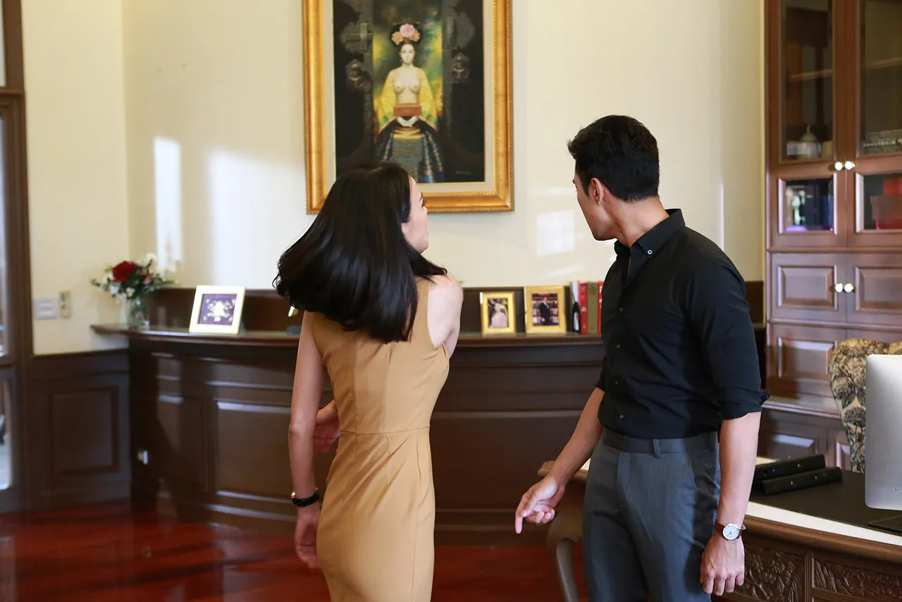ฉากนี้ถ่ายทำกันที่บ้านคุณชุ้น กระทุ่มแบน เป็นฉากดราม่าของ เอส กับ รถเมล์ อีกฉากหนึ่ง ที่เล่นกันแบบระบบตาต่อตา ฟันต่อฟัน ไม่มีใครยอมใคร ฉะมาฉะไป โดยมีแม่ตุ๋ย นวลปรางค์ มาร่วมผสมโรงด้วย แต่ครั้งนี้เอส ไม่ยอมเป็นเบี้ยล่าง เพราะโมโห ที่ทั้งคู่ร่วมกันวางแผนใส่ร้ายนาว แล้วยังจะไปขายหุ้นให้พวกเจ้าเล่ห์อีก เพราะตั้งใจจะเก็บโรงแรมให้เป็นมรดกกับลูกๆ ทั้งคู่ฟาดกันไปฟาดกันมา อารมณ์ขึ้น ดราม่าจัดเต็มทั้งคู่