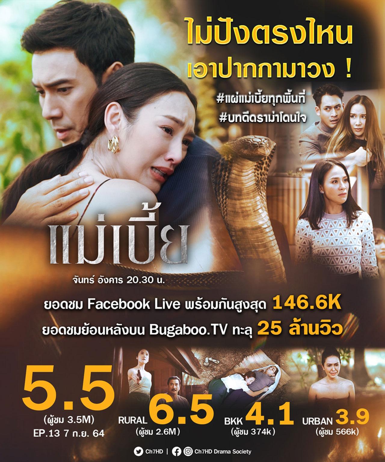 ยิ่งเข้าสู่ช่วงปลายเรื่อง ความแซ่บของละคร “แม่เบี้ย” ทาง ช่อง 7HD ก็ยิ่งเข้มข้นขึ้นทุกที ทำเอาแฟนๆ ทุกพื้นที่ติดหนึบละคร จนกระแสแรงไม่หยุด โดยเฉพาะสัปดาห์ล่าสุด แม่เบี้ย EP.13 เรตติ้งพุ่งสูงถึง 5.5 (ข้อมูลวันที่ 7 กันยายน 64) มียอดชม Facebook Live พร้อมกันสูงสุด 146.6K และมียอดชมย้อนหลังบน Bugaboo.tv ทะลุ 25 ล้านวิว