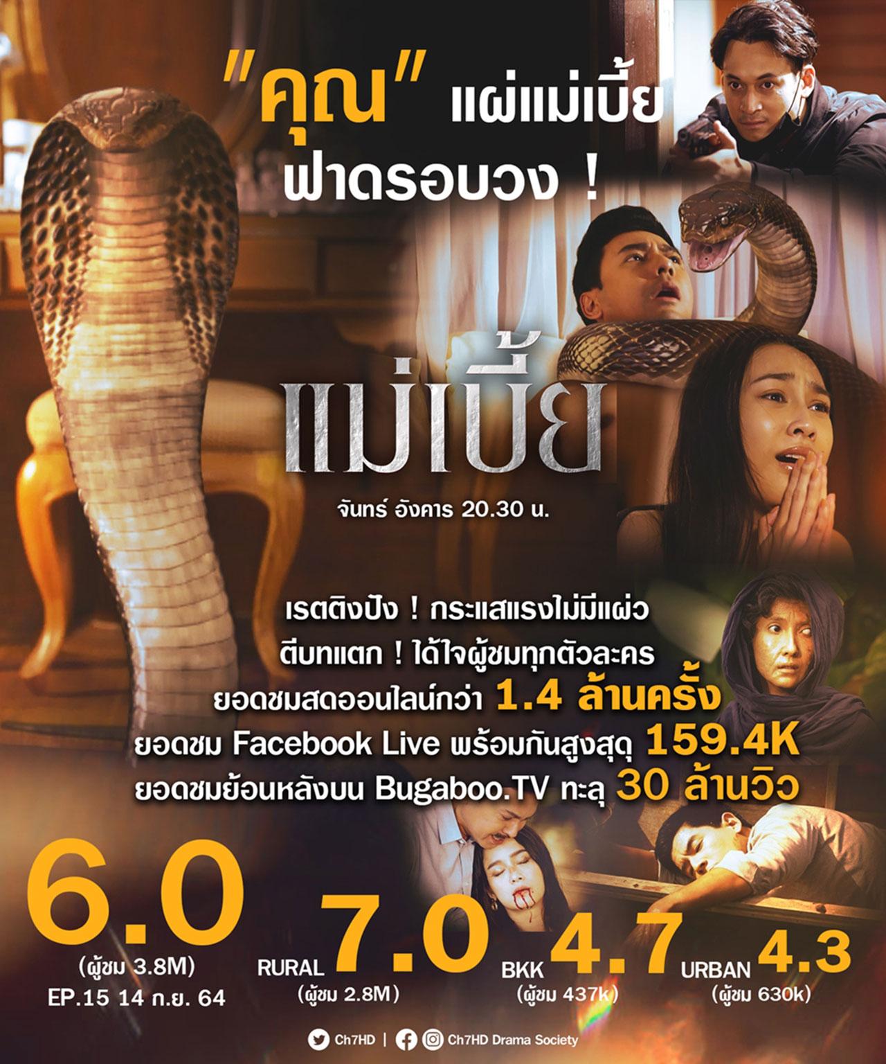ยิ่งเข้าใกล้โค้งสุดท้าย กระแสตอบรับของละครเรื่อง “แม่เบี้ย” ทาง ช่อง 7HD ก็ยิ่งแรงไม่แผ่ว ซึ่งสัปดาห์ล่าสุด นาว-ทิสานาฏ ศรศึก กับ รถเมล์-คะนึงนิจ จักรสมิทธานนท์ ปะทะบทบาท ฟาดอารมณ์ดราม่า จนแฟนละครซู้ดปาก! ทำเรตติ้งพุ่งถึง 6.0 (ข้อมูลวันที่ 14 กันยายน 64) และมียอดชมสดออนไลน์กว่า 1.4 ล้านครั้ง มียอดชม Facebook Live พร้อมกันสูงสุด 159.4K แถมยังมียอดชมย้อนหลังบน Bugaboo.tv ทะลุ 30 ล้านวิว