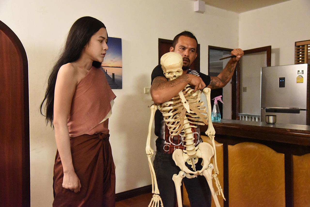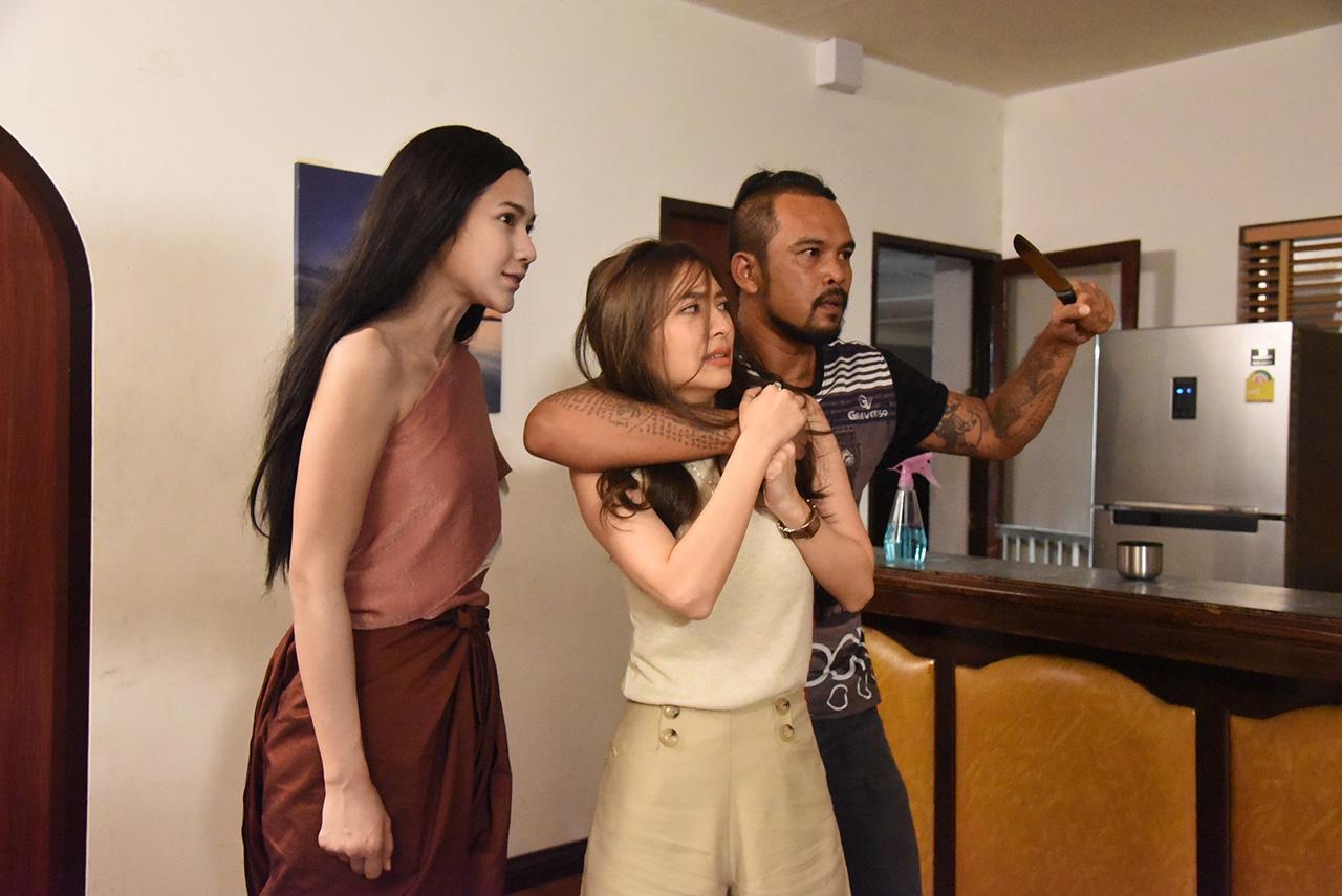 ฉากนี้ถ่ายทำกันที่บ้านสุขุมวิท 101/1 เป็นฉากที่ต้องถ่ายทำเป็นคัตๆ ทั้งคัตที่มิวสู้กับผีมายด์คนเดียว ถ่ายหลายมุมกล้องมาก ก่อนจะเป็นคัตที่ตัวประกอบขโมยล็อกคอมิว แล้วก็เปลี่ยนมาเป็นพี่ก้อย วาสนา โดนล็อกคอด้วย แล้วก็จับมือผู้ร้าย จนผู้ร้ายได้สติตกใจวิ่งหนีผี ส่วนผีมายด์ก็โกรธแค้นสุดขีด ถ่ายกันไปมาหลายมุมกล้อง กว่าจะได้ภาพที่ต้องการ ทั้งมายด์และมิวยอมรับว่าเล่นจนเหนื่อย พอตอนที่ เจมส์ มาร์ วิ่งเข้ามา ก็ต้องถ่ายสลับกันไปมาอีก เรียกว่าเป็นฉากสั้นๆ ที่ใช้เวลาถ่ายทำพอสมควร เพื่อจะได้ตัดต่อภาพและได้อารมณ์ละครผี