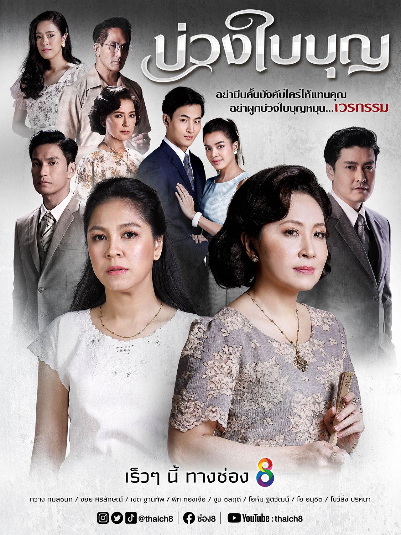 ต่อด้วยละครแนวพีเรียดดราม่า “บ่วงใบบุญ” เรื่องราวของดอกรัก คุณนายประจำบ้านเรือนบุญ ผู้ที่ดูดี สวยสง่า หมั่นเข้าวัด ทำบุญ และถือศีล แต่เบื้องหลังคือความทะเยอทะยาน ถีบตัวเองจากสาวใช้ขัดดอก จนมาเป็นเมียรองของคุณพระบุญญานุภาพ เธอใช้เล่ห์เหลี่ยมมารยาจนคุณพระยอมแยกบ้านให้ เบื้องหลังความงดงาม และคำพูดหวานหู คือการคบชู้สู่ชาย ทุกคนในบ้านยอมเชื่อฟังคำสั่งของคุณนายดอกรัก เว้นแต่ ใบบุญ หลานสาวที่เกิดจากลูกชายที่เป็นจิตเภทกับลูกสะใภ้ ใบศรี ที่เป็นใบ้ ได้นักแสดงมากฝีมืออย่าง “จอย-ศิริลักษณ์” กลับมารับละครอีกครั้ง ในรอบหลายปี กับบทคนใบ้ชีวิตสุดรันทด ปะทะคารมณ์เดือดกับนักแสดงชั่วโมงบินสูง “กวาง-กมลชนก” ที่เรื่องนี้เธอพลิกมาเล่นแบบร้ายสุดขั้ว ไม่พอยังได้นักแสดงนำชายการันตีรางวัลผลงานมากมายอย่าง “โอ-อนุชิต” พร้อมด้วย เขตต์ ฐานทัพ, พีท ทองเจอ ที่จะมาทำให้เรื่องราวเข้มข้นขึ้น และถือเป็นความโชคดีของนักแสดงดาวรุ่งดวงใหม่ของช่อง 8 อย่าง โอห์ม-ฐิติวัฒน์, จูน-ชลฤดี, โบว์ลิ่ง-ปริศนา, แอนนา เสืองามเอี่ยม, ปุ๊กปิ๊ก-ฌอร์ลชัญ และ อาร์ม-สุกวิณ ที่ได้ร่วมประชันบทบาทกับนักแสดงมากฝีมือหลายท่าน ถือได้ว่าเป็นบทที่ท้าทายของดาวรุ่งดวงใหม่ที่น่าจับตามอง รวมถึงสองซุป'ตาร์ดาวค้างฟ้าที่จะมาประชันบทบาทกันอีกด้วย