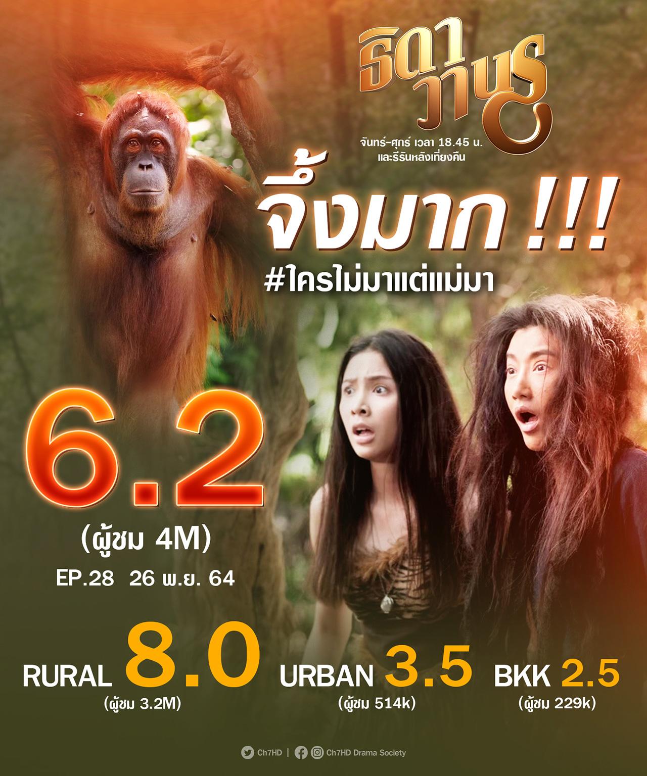 ยืนหนึ่งรับมงได้อย่างภาคภูมิใจ สำหรับละครก่อนข่าวภาคค่ำ “ธิดาวานร” ทางช่อง 7HD ที่ล่าสุดทำเรตติ้งพุ่งไปถึง 6.2 (ข้อมูลวันที่ 26 พ.ย. 2564) ผู้ชมกว่า 4 ล้านคน โดยนอกเขตเทศบาลสร้างปรากฏการณ์เรตติ้งวิ่งไปถึง 8.0 โดยมีผู้ชมกว่า 3.2 ล้านคน ส่งผลให้ผู้จัดละครค่ายดีด้าฯ ลอร์ด สยม สังวริบุตร ปลื้มใจกับกระแสของละครที่แรงขึ้นทุกวัน พร้อมขอบคุณแฟนละคร และชื่นชมความตั้งใจของเหล่านักแสดง ก่อนจะการันตีความสนุก ยิ่งใกล้บทสรุปยิ่งเข้มข้น
