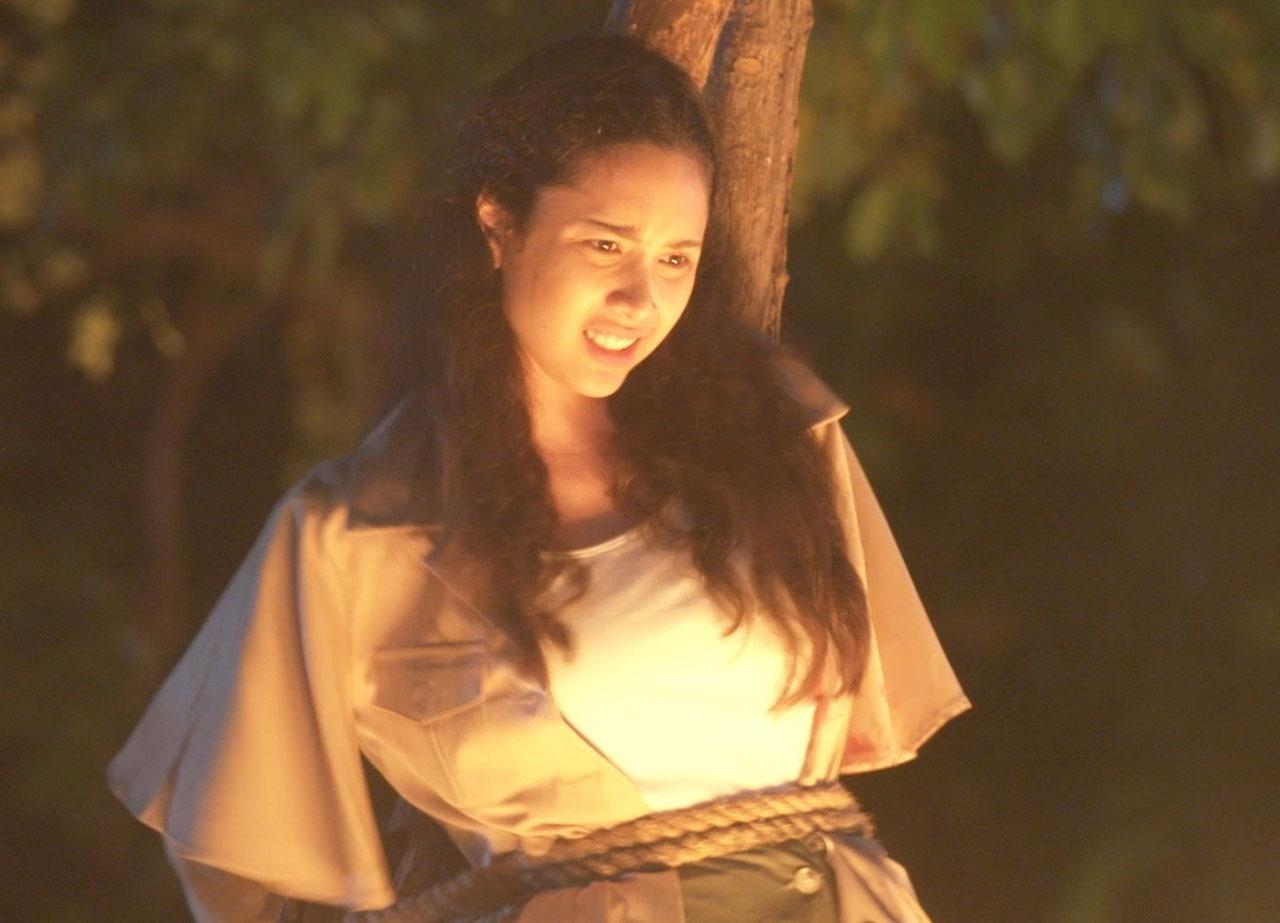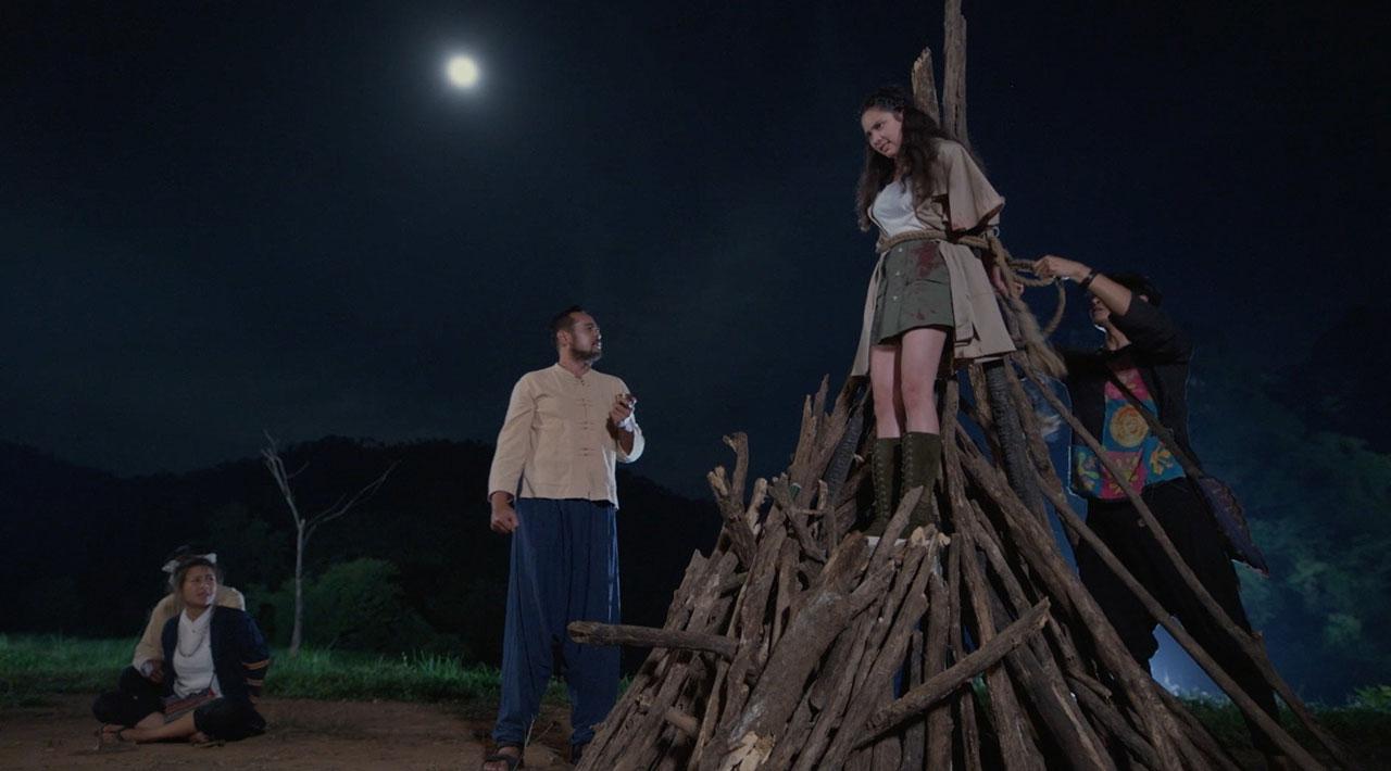 ผู้กำกับฯ ไม่รอช้า ยกฉากที่ “อิยะวดี” จะต้องถูกจับบูชายัญมาถ่ายก่อนเลย ว่าแล้วก็ให้ทีมงานจัดฉากสุมกองฟืน ท่ามกลางบรรยากาศเย็นๆ ยามค่ำคืนพระจันทร์เต็มดวง แล้วก็จับ “ปิ่น” มัดกับเสาบนกองฟืนสูงจากพื้นดินเกือบเมตร “ปุ๊กกี้” ก็เล่นส่งอารมณ์ดี๊ดีร้องไห้โฮขอชีวิตเจ้านางน้อยที่กำลังจะถูกไฟเผา พอจุดไฟลุกพึ่บ ถึงจะเป็นเอฟเฟกต์ก็ทำเอาสะดุ้งโหยงเหมือนกัน แต่สาว “ปิ่น” ก็มือโปรฯ พอตัว เล่นได้ผ่านฉลุย