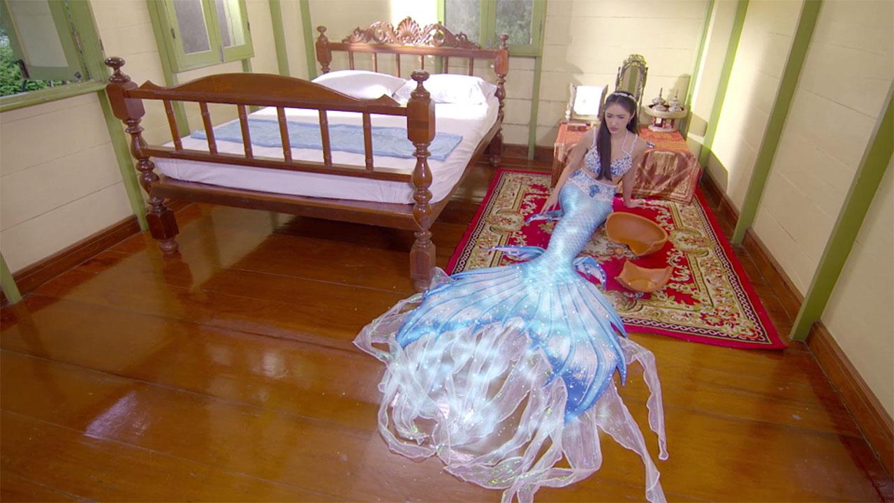 หลังจากคิวทุกอย่างลงตัว ถ่ายจริงเริ่มที่ยีนหนีตายจากศึกใต้บาดาลจนโดนพายุซัดขึ้นบกมาเจอกอล์ฟ ยีนสลบล้มลงไป กอล์ฟจึงพายีนมาที่บ้าน ในขณะที่ยีนสลบอยู่ กอล์ฟหลงเคลิ้มในความงามของยีน จนเผลอมองเข้าไปใกล้ ยีนตกใจตื่นไม่มีที่ไป กอล์ฟเลยใจดีให้พักฟื้นที่บ้านไปก่อน รุ่งเช้ายีนตื่นขึ้นมาจะล้างหน้า แต่เผลอทำอ่างแตกน้ำโดนตัวจนตัวเองกลายร่างเป็นนางเงือก