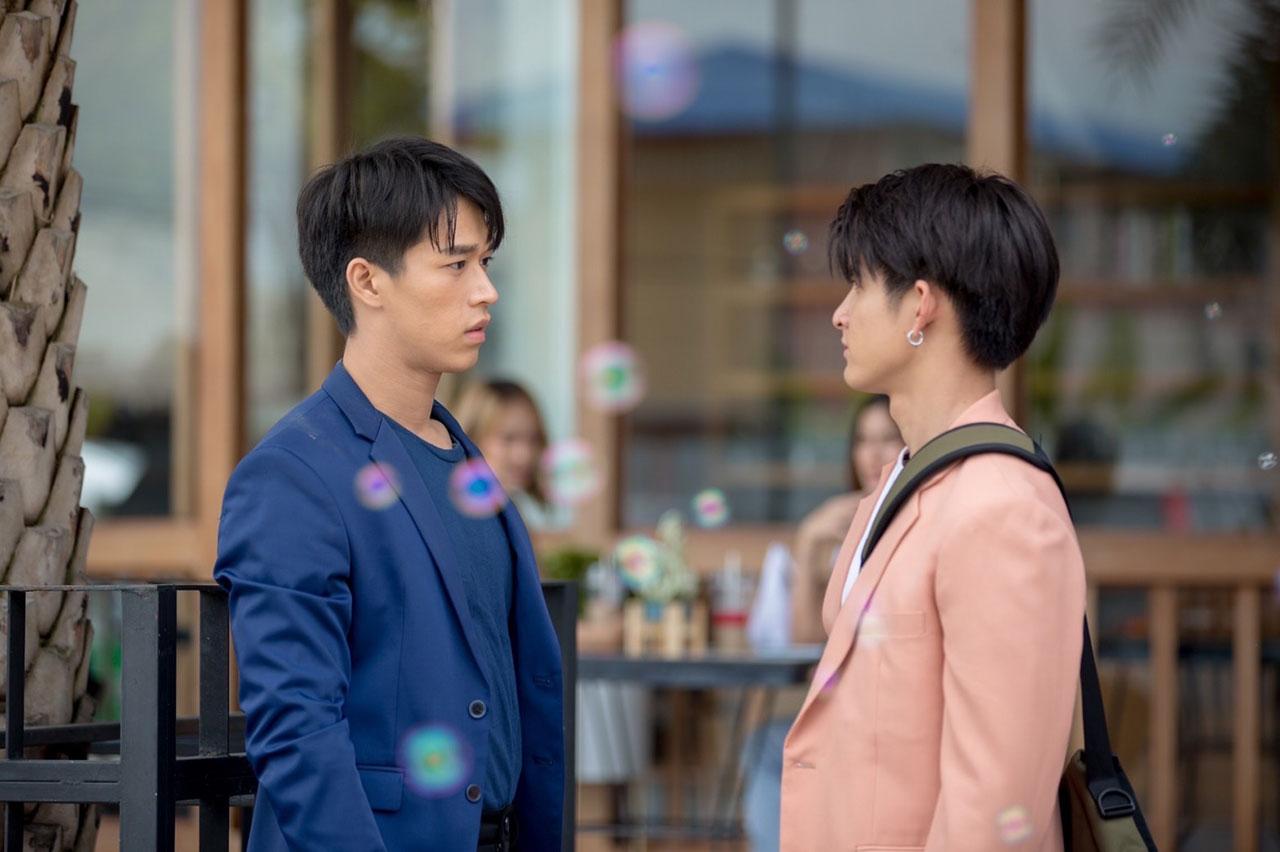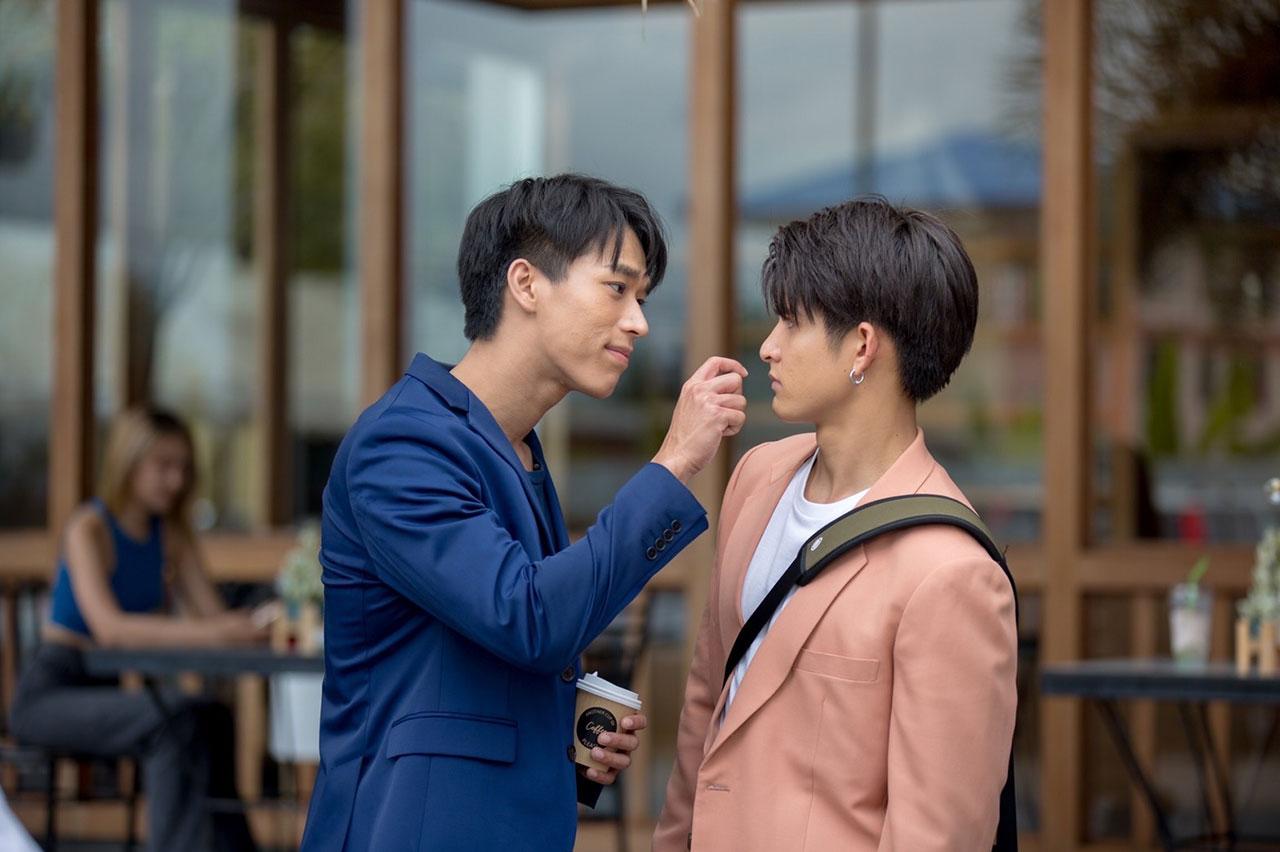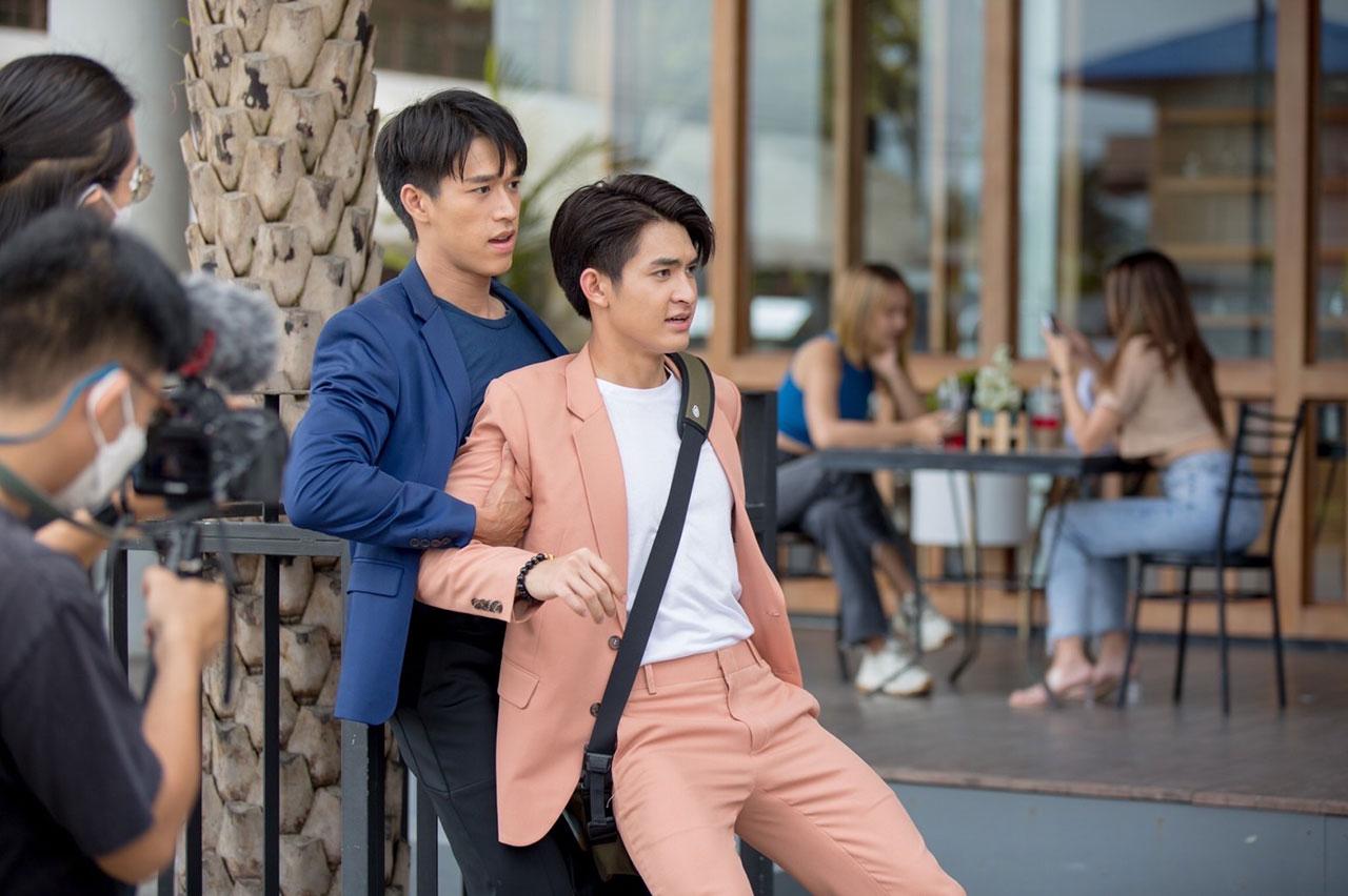กับฉากที่ เดียว (วิน ทรงสิน) มัวแต่เดินคุยโทรศัพท์จนเกือบจะโดนรถชน โชคดีที่ รัก (เอิร์ท ธนกฤษ) กระโดดเข้ามาช่วยไว้ได้ทัน แต่งานนี้แทนที่รักจะขอบคุณ ดันต่อว่าเดียวที่ทำกาแฟหกใส่รองเท้า จนเกิดการปะทะคารมกันเกิดขึ้น ซึ่งเบื้องหลังการถ่ายทำฉากนี้ ผู้กำกับ นก-จิรศักดิ์ ยกกองไปถ่ายทำกันที่ แอ็กซ์ สตูดิโอ จ.ปทุมธานี และเพราะเป็นฉากเปิดตัวของทั้งคู่ ผู้กำกับ เลยจัดซีนชวนจิ้น มาเสิร์ฟแฟนๆ เมื่อเซตทุกอย่างพร้อม ผู้กำกับจึงเรียกสองหนุ่มมาซักซ้อมคิว ทันที