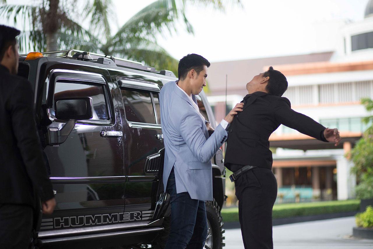 ฉากนี้ถ่ายทำกันที่โรงแรมเลอเมอริเดียน บางนา เป็นฉากเปิดเรื่องที่การถ่ายทำวุ่นวายพอสมควร และคนที่เหนื่อยกว่าใครก็คือสาวฮาน่า ที่ต้องวิ่งหนีตั้งแต่ในโรงแรมออกมาหน้าโรงแรมเลยทีเดียว ไม่ใช่วิ่งรอบเดียว แต่วิ่งอยู่หลายรอบ แถมไม่ใช้สแตนด์อิน วิ่งตัดหน้ารถบิ๊กเอ็มอีกหลายเทก เพื่อให้ได้ภาพที่สมจริง เรียกว่าทำเอาฮาน่าทั้งเจ็บทั้งหมดแรงจริง ก่อนจะดึงบิ๊กเอ็มมาจูบกันอีก ถ่ายกันหลายเทก หลายมุม เพื่อให้ได้ภาพที่สวยงามเช่นกัน ก่อนจะสลบไป คราวนี้เป็นหน้าที่ของบิ๊กเอ็ม ที่จะโชว์คิวบู๊ต่อ กับลูกน้องของเสี่ยเฉลิมพร งานนี้สบายมาก สำหรับพระเอกนักบู๊อย่างบิ๊กเอ็ม ผ่านแบบฉลุยเลย