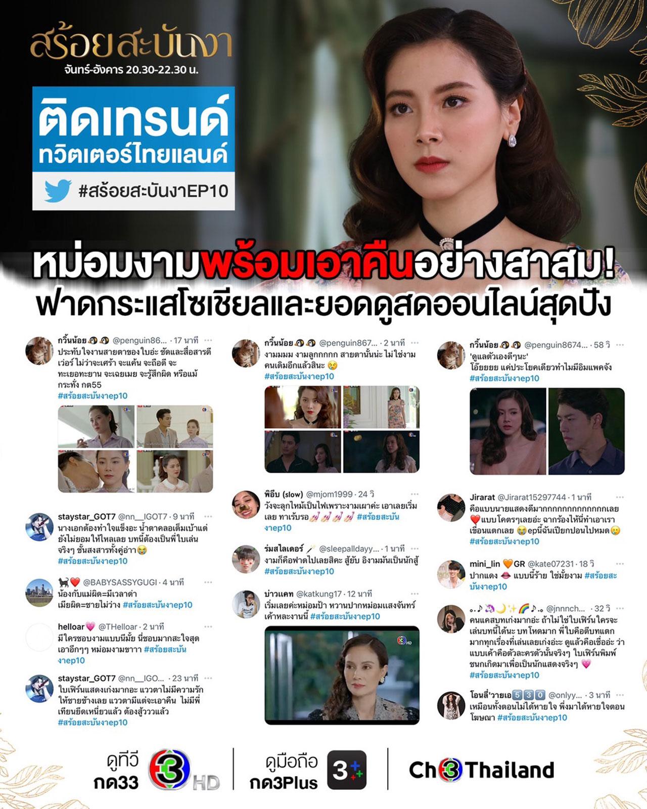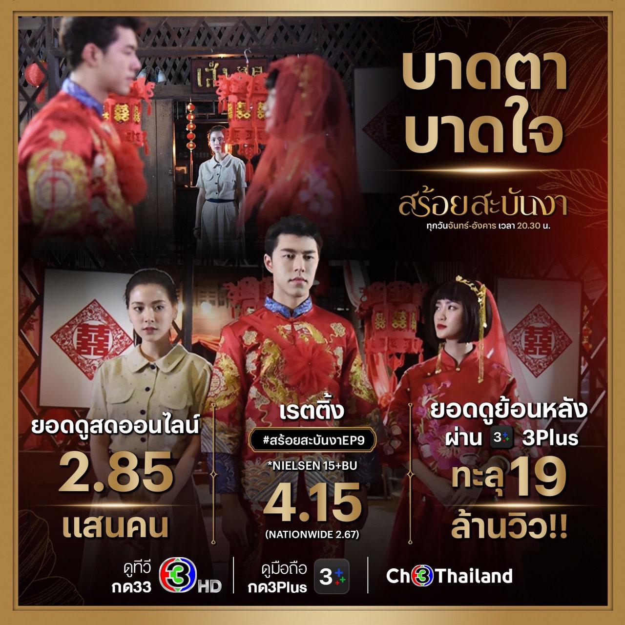 ทำแฟนละครแทบหยุดหายใจ สำหรับ “สร้อยสะบันงา” ทางช่อง 3 กับฉากบีบหัวใจเค้นน้ำตาคลอเบ้าระหว่าง “เทียน” นำแสดงโดย “นาย ณภัทร” และ “งาม” นำแสดงโดย “ใบเฟิร์น พิมพ์ชนก” ที่ตัดสินใจร่วมหอลงโรงไปกับ “ชายช้าง” หรือ “ปั้นจั่น ปรมะ” จนแฟนๆ ซื้อตั๋วลงทัวร์เต็มคันรถออกโรงป้องพี่เทียนหัวใจทองคำสุดกำลัง ปลุกกระแสโลกโซเชียลทำเอาแฮชแท็ก #สร้อยสะบันงาep9-10 พุ่งทะยานติดเทรนด์ทวิตเตอร์อย่างรวดเร็ว การันตีจากเรตติ้งในกรุงเทพฯ EP.9 ทำไปได้ 5.483 เรตติ้งเฉลี่ยทั่วประเทศในกลุ่มผู้ชมอายุ 15 ปีขึ้นไป ในกลุ่ม (Bangkok and Urban) หรือ 15+ BU ทำไปได้ถึง 4.15 และ EP.10 เรียกเรตติ้งสะท้านในพื้นที่กรุงเทพฯ ไปได้ถึง 5.163 ในส่วนของ 15+ BU ทำไปได้ถึง 4.30 นอกจากนี้ยังทำยอดคนดูสดออนไลน์ตอนล่าสุดสูงถึง 3.3 แสนคน ดูย้อนหลังผ่าน 3Plus ทะลุ 20 ล้านวิว เรียกว่ายิ่งดูยิ่งอินของจริง!
