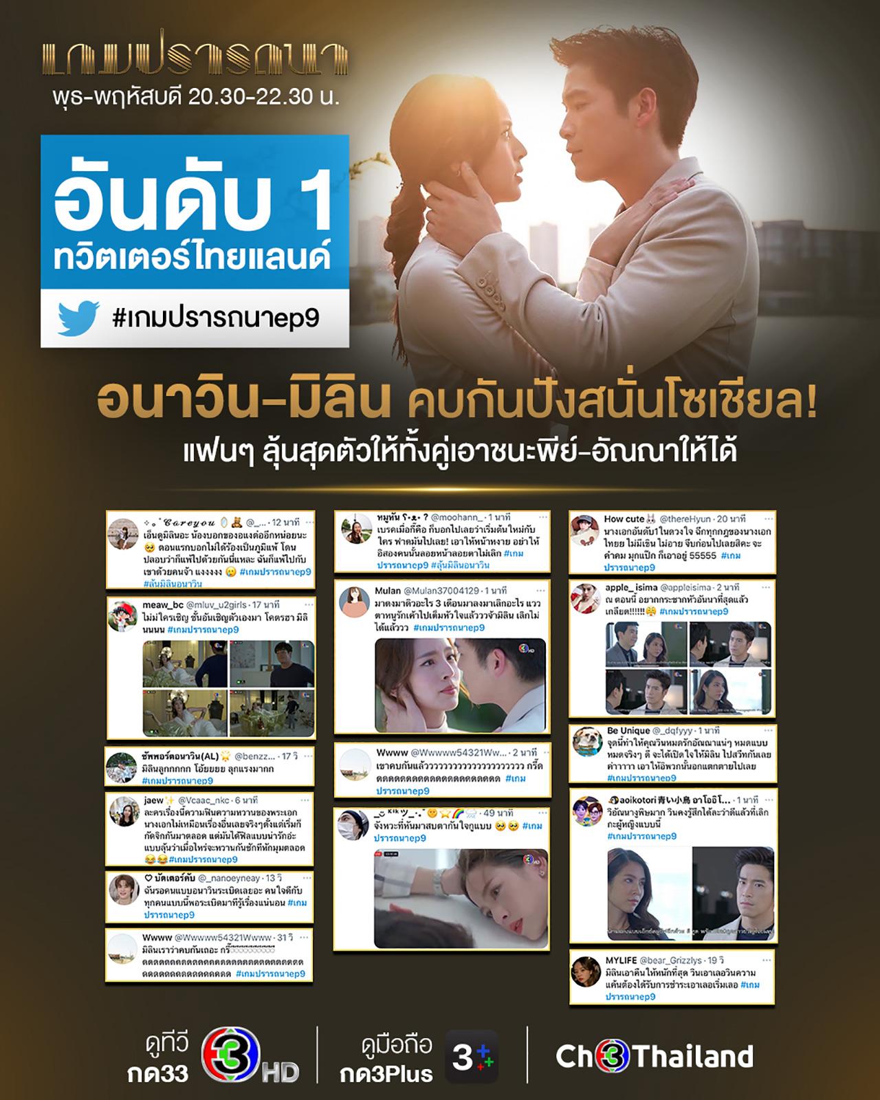 หวานจนได้เรื่องกับละคร “เกมปรารถนา” ทางช่อง 3 กับความปังเกินต้านของฉากชวนฟินจิกหมอนระหว่าง “อนาวิน” แสดงโดย “อาเล็ก ธีรเดช” ที่ตัดสินใจคบกับ มิลิน แสดงโดย “ณิชา ณัฏฐณิชา” ก็ได้รับกระแสตอบรับจากแฟนละครอย่างล้นหลาม เริ่มจุดไฟรสแซ่บให้ชาวเน็ตปั่นความฟินด้วยแฮชแท็ก #เกมปรารถนา ep.9 จนมือเป็นระวิงพุ่งติดเทรนด์ทวิตเตอร์ประเทศไทยอันดับ 1 พร้อมโกยกระแสคำชมยกขึ้นหิ้งละครพล็อตดีบทสนุก