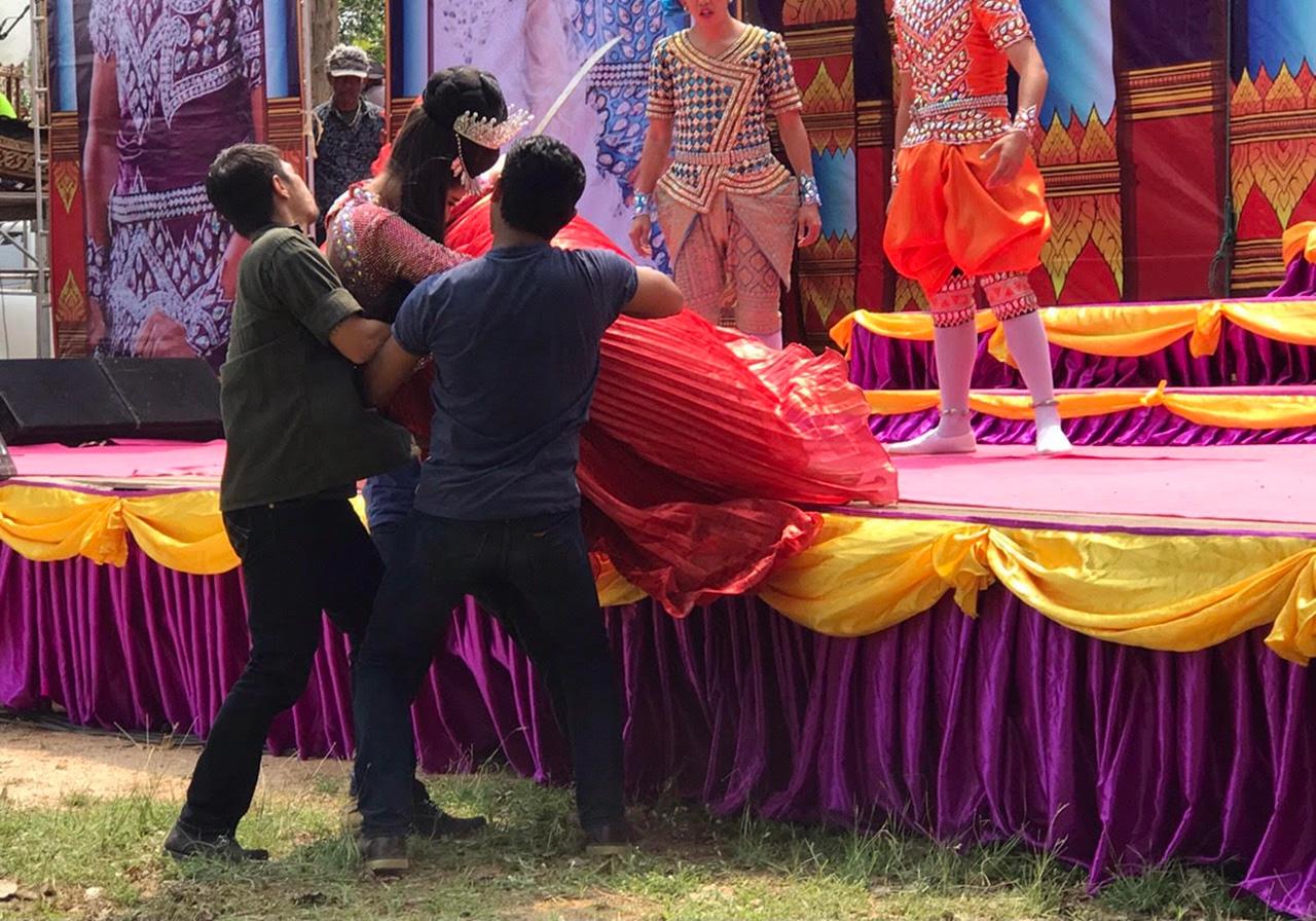 พอถ่ายฉากร้องลิเกเสร็จแล้ว ก็มาถีงฉากที่อินทราโดนพวกอันธพาลฉุดลงเวที และมีบู๊กันพอหอมปากหอมคอ ก่อนถ่ายทำก็ต้องมีการซักซ้อมให้เป็นที่เข้าใจกันก่อน โดยเฉพาะฉากที่จะต้องฉุดน้องอลิศลงจากเวที ถ้าพลาดนางเอกน้องใหม่มีสิทธิ์เจ็บตัวแน่นอน ส่วนคิวบู๊ของพระเอกกับผู้ร้ายก็เป็นไปอย่างสบายๆ เพราะพระเอกน้องใหม่ได้ฝึกคิวบู๊ก่อนถ่ายทำมาหลายเดือนแล้ว เมื่อทุกอย่างพร้อมก็ลงมือถ่ายทำทันที โดยตั้งกล้องถ่ายทำที่ด้านล่างเวทีก่อน หลังจากนั้นผู้กำกับจึงให้ย้ายกล้องมาตั้งบนเวที เพื่อรับอีกมุมหนึ่งของการแสดง