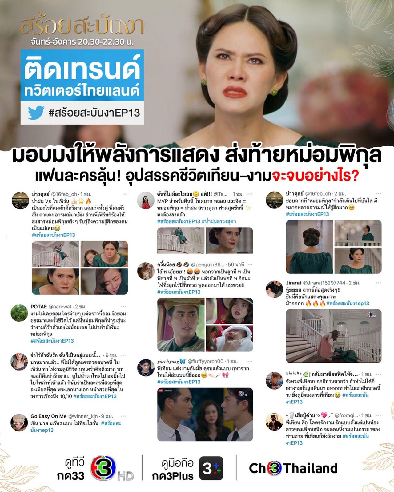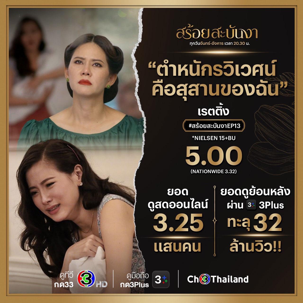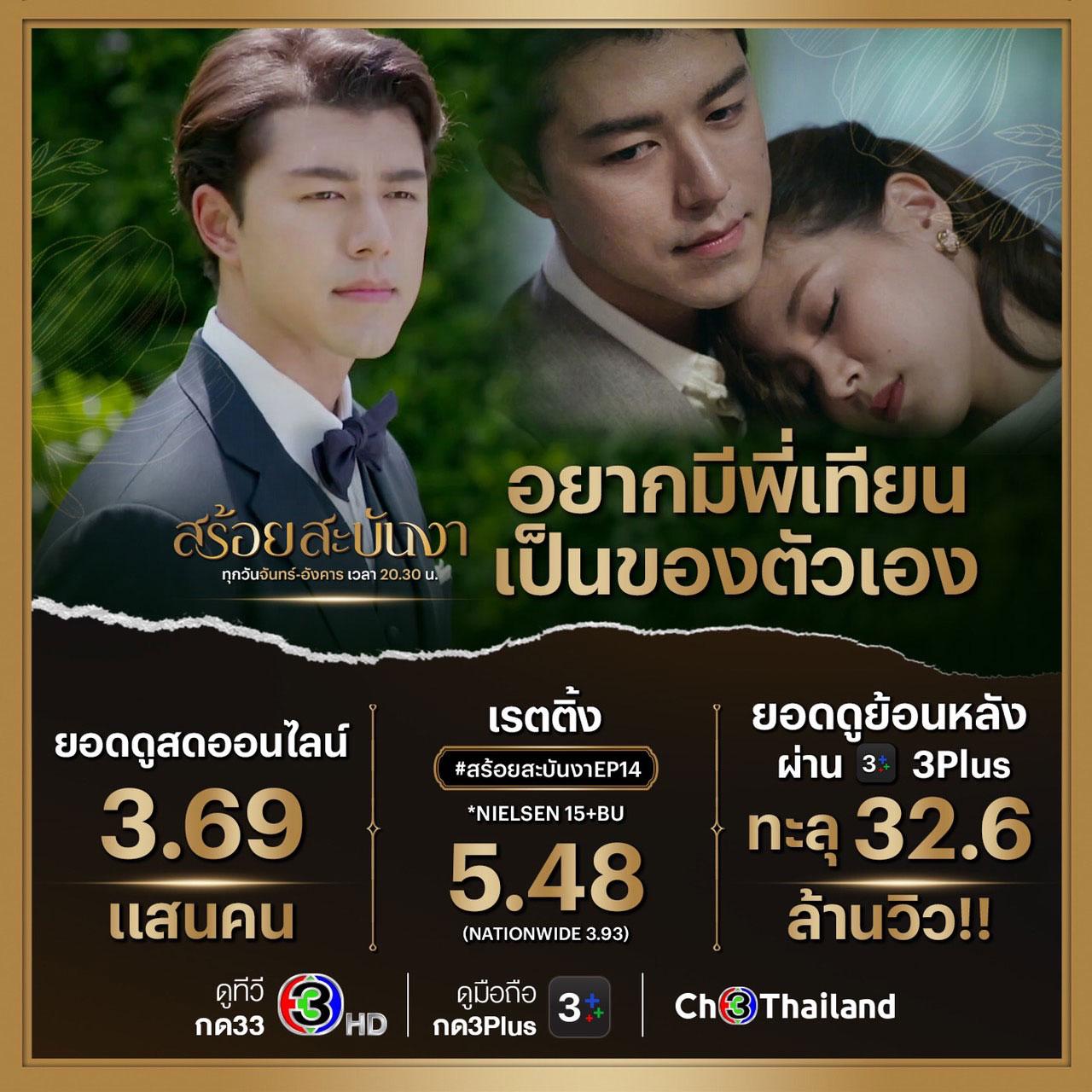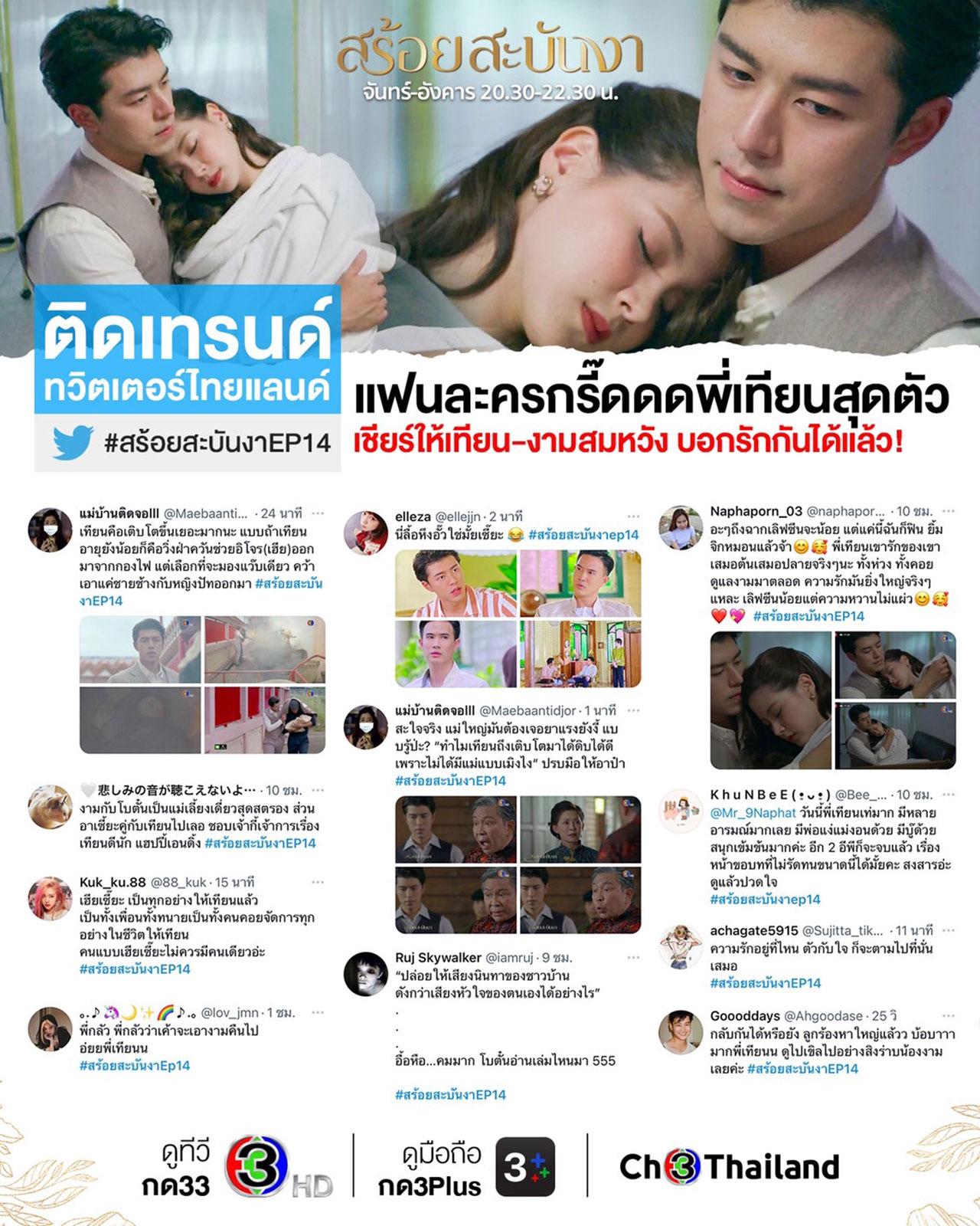 ยิ่งใกล้จบยิ่งปัง! ว่าไม่ได้ของเขาดีจริงๆ สำหรับ “สร้อยสะบันงา” ทางช่อง 3 ของผู้จัด “นก จริยา แอนโฟเน” ที่จับเคมีได้เข้ากั้นเข้ากันของ “นาย ณภัทร เสียงสมบุญ” และนางเอกสาวสวยคู่ใจ “ใบเฟิร์น พิมพ์ชนก ลือวิเศษไพบูลย์” ทำผู้ชมอินหนักหลังสาดกระแสความปังไปทั่วบ้านทั่วเมือง แฟนๆ ยกขึ้นหิ้งละครพีเรียดคุณภาพ!