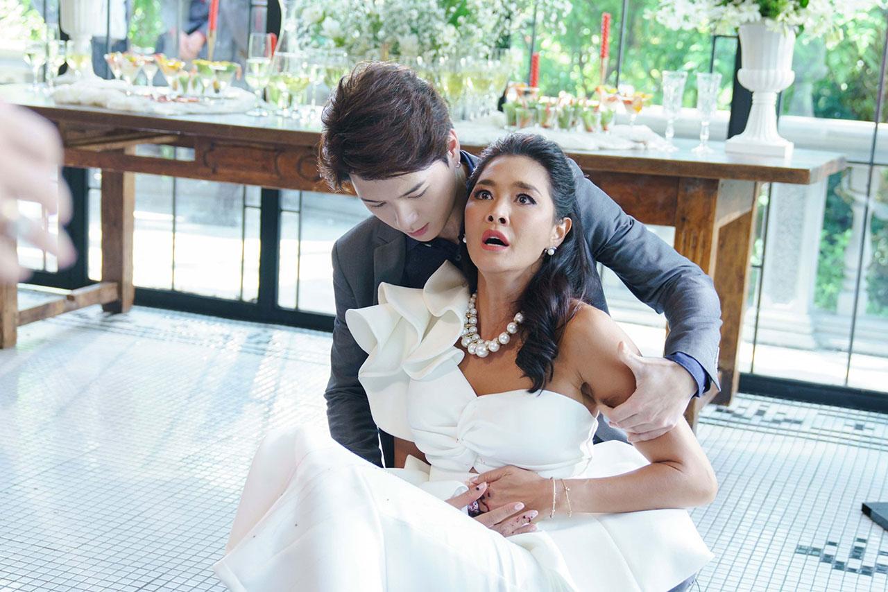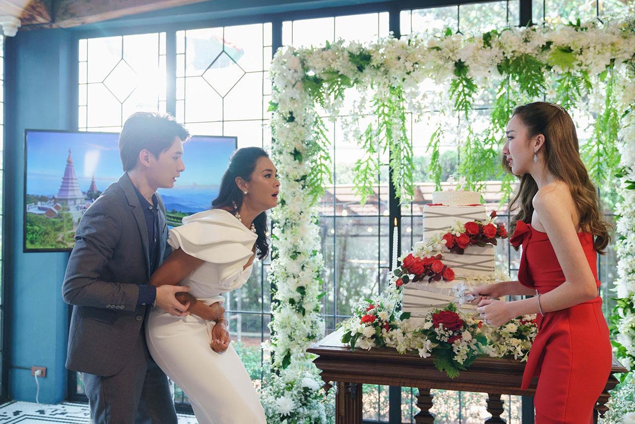 ซึ่งพอทุกฝ่ายเข้าใจตรงกันดีแล้ว ทั้งทีมกล้อง ทีมนักแสดงหลัก และนักแสดงร่วมเข้าใจทุกอย่างกันดีแล้ว ผู้กำกับก็สั่งเดินกล้องถ่ายทำทันที คริสส่งสายตาหวานเยิ้ม หยอดคำหวานสัญญารัก แล้วคุกเข่าลงต่อหน้าอ้าย ยื่นแหวนขอแต่งงาน ท่ามกลางเสียงกรี๊ดกร๊าดดีใจของแขกในงาน แต่ระหว่างที่อ้ายกำลังฟินกับโมเมนต์สวีต ก็ถูกหักมุมอารมณ์ด้วยคลิปลับที่ถูกเปิดโชว์บนจอโปเจกเตอร์กลางงาน ทำเอาอ้ายช็อก อึ้ง ทำตัวไม่ถูก คริสพยายามเรียกสติแต่อ้ายไม่สนใจ คว้ามีดตัดเค้กแทงคริส แต่จังหวะนั้นลูกเกดก็เข้ามาขัดขวางทำให้โดนแทงเข้าเต็มๆ อ้ายสติหลุดรีบวิ่งหนีออกจากงานไป ซึ่งก็ได้ภาพ ได้อารมณ์สมใจผู้กำกับ ที่ถึงกับเอ่ยปากชมว่าทุกคนคือโปรเฟสชันนอล แสดงอารมณ์ได้เข้าถึงตัวละคร เปลี่ยนมุมกล้อง รับหลายมุม แต่นักแสดงสปิริตเกินร้อย กี่เทกก็ไม่หวั่น คุยเล่นปล่อยมุกตลก แถมยังชวนกันถ่ายรูปโพสท่ากันอย่างเฮฮา เพราะนานๆ ทีจะได้อยู่พร้อมหน้าพร้อมตากันครบทีม เรียกว่าเบื้องหน้าดราม่ายับ เบื้องหลังสนุกสนานเกินต้านไม่แพ้กัน